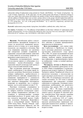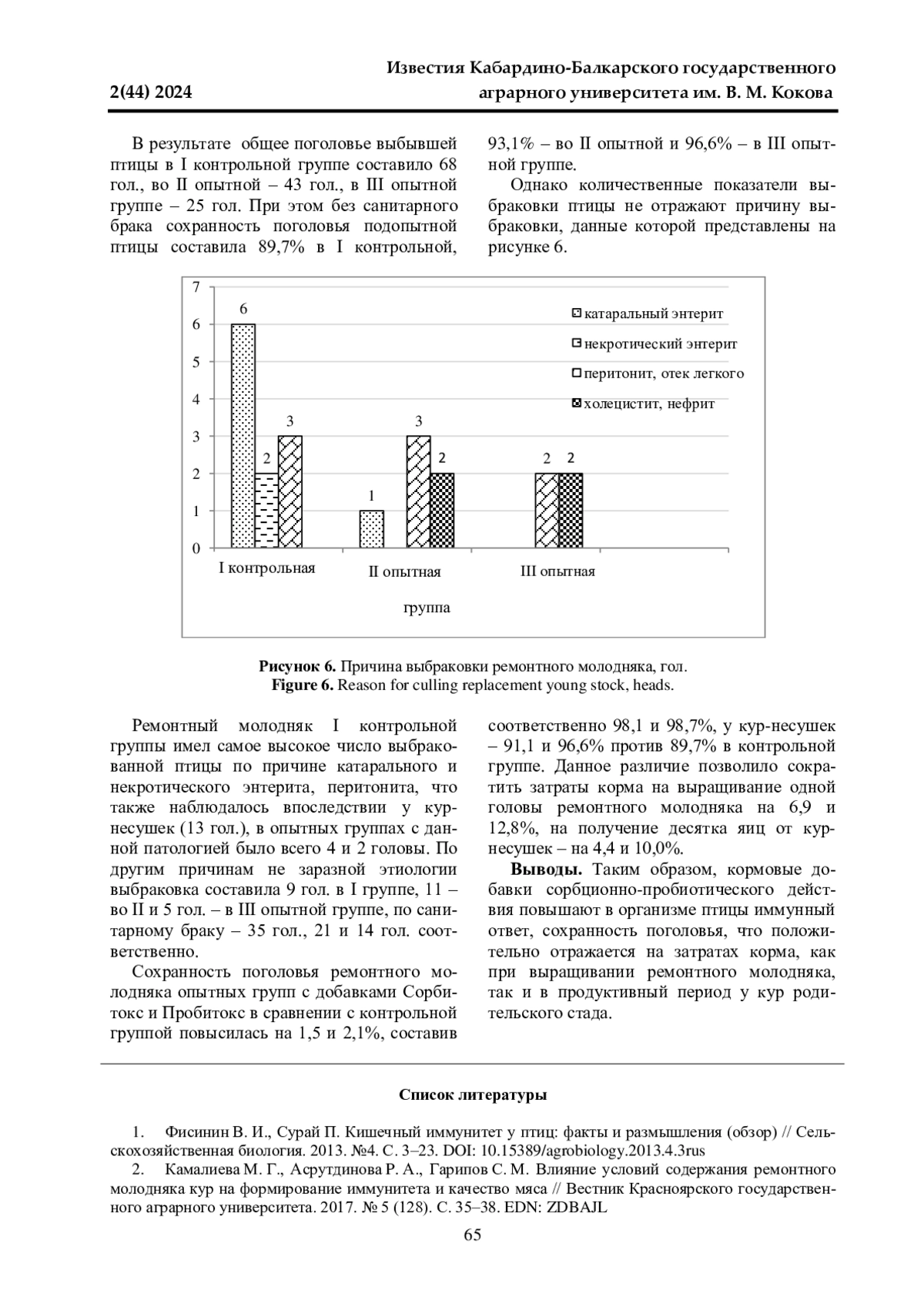 7. 	Овчинников А. А., Матросова Ю. В., Коновалов Д. А. Продуктивность ремонтного молодняка кур при использовании в рационе пробиотических кормовых добавок // Пермский аграрный вестник. 2018. № 4(24). С. 132-137. EDN: EVUEKW