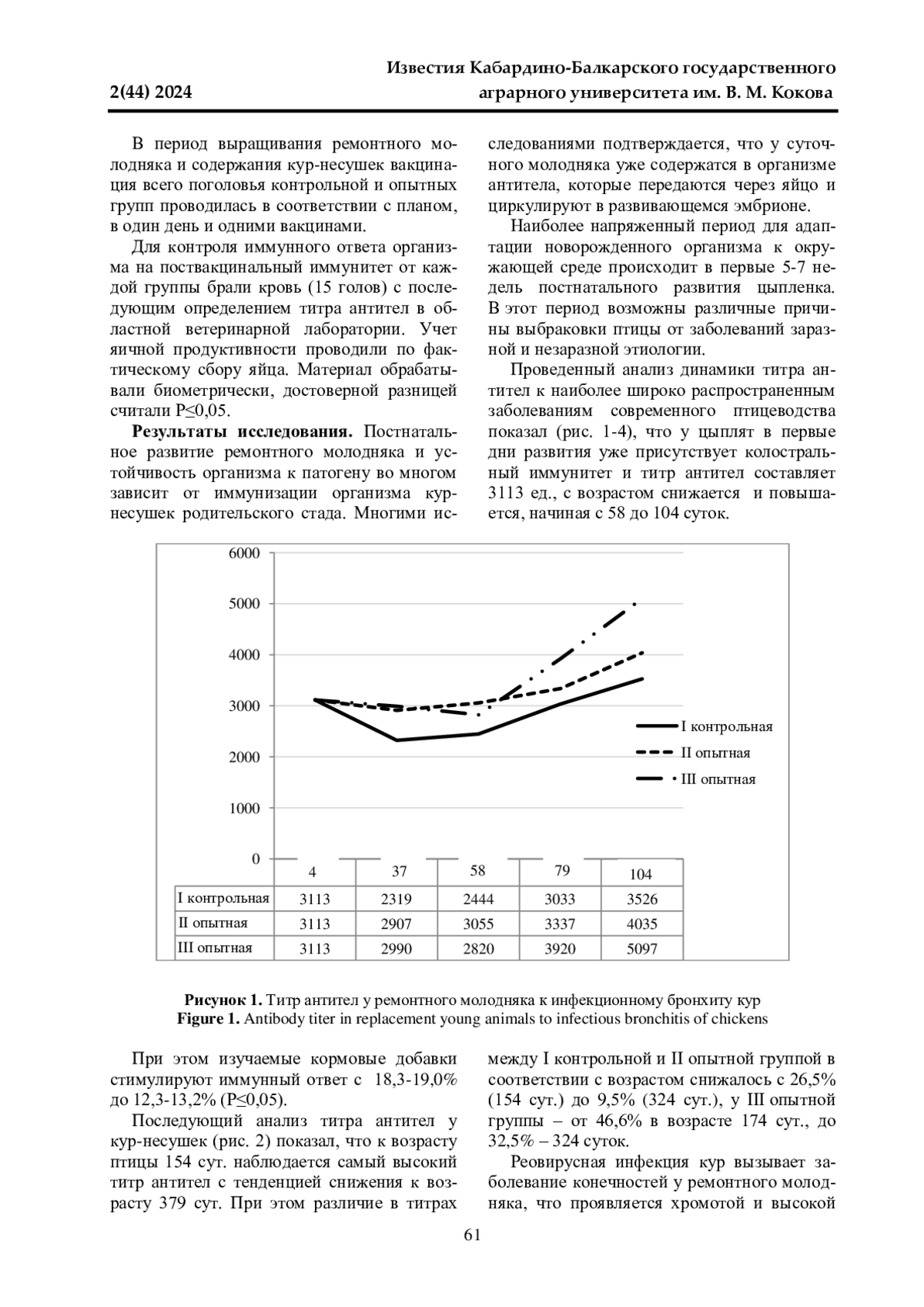 Не все используемые в рационах сельскохозяйственных животных и птицы биологически активные добавки могут проявлять выраженный иммуностимулирующий эффект. В сравнительном эксперименте проведено изучение двух сорбционно-пробиотических добавок при выращивании ремонтного молодняка и кур-несушек родительского стада кросса «Росс-308» в количестве 0,50 кг/т корма. Анализ титра антител у птицы в период выращивания показал, что цыплята рождаются уже с колостральным иммунитетом к основным инфекционным заболеваниям птицы. В постнатальный период в результате плановых вакцинаций иммунный ответ в организме повышается к 107 суткам, а у курнесушек - к 154 суткам и, впоследствии, снижается к 379 суткам. Кормовая добавка Сорбитокс в сравнении с контрольной группой снизила выбраковку ремонтного молодняка на 5 гол., с Пробитоксом - на 7 гол., у кур-несушек - на 7 и 15 гол. соответственно. При этом, если в контрольной группе с заболеваниями инфекционной этиологии было выбраковано 8 гол., то в группе с Сорбитоксом число птицы с данной патологией снизилось до 1 головы в группе, с добавкой Пробитокса их не было, санитарный брак в группах с изучаемыми кормовыми добавками уменьшился на 14 и 21 голову. Сохранность ремонтного молодняка с добавкой Сорбитокс увеличилась на 1,5%, кур-несушек - на 1,4%, в группе с Пробитоксом - на 2,1 и 6,9% соответственно, а затраты корма сократились на 4,4-12,8%.