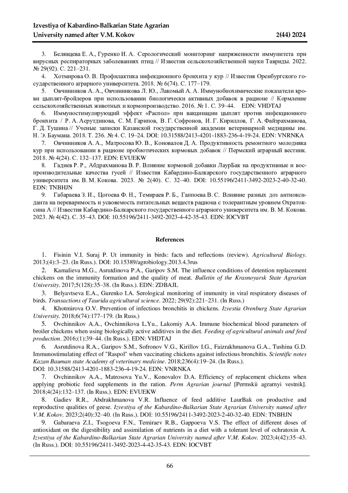 8. 	Гадиев Р. Р., Абдрахманова В. Р. Влияние кормовой добавки ЛаурБак на продуктивные и воспроизводительные качества гусей // Известия Кабардино-Балкарского государственного аграрного университета им. В. М. Кокова. 2023. № 2(40). С. 32-40. DOI: 10.55196/2411-3492-2023-2-40-32-40 EDN: TNBHJN