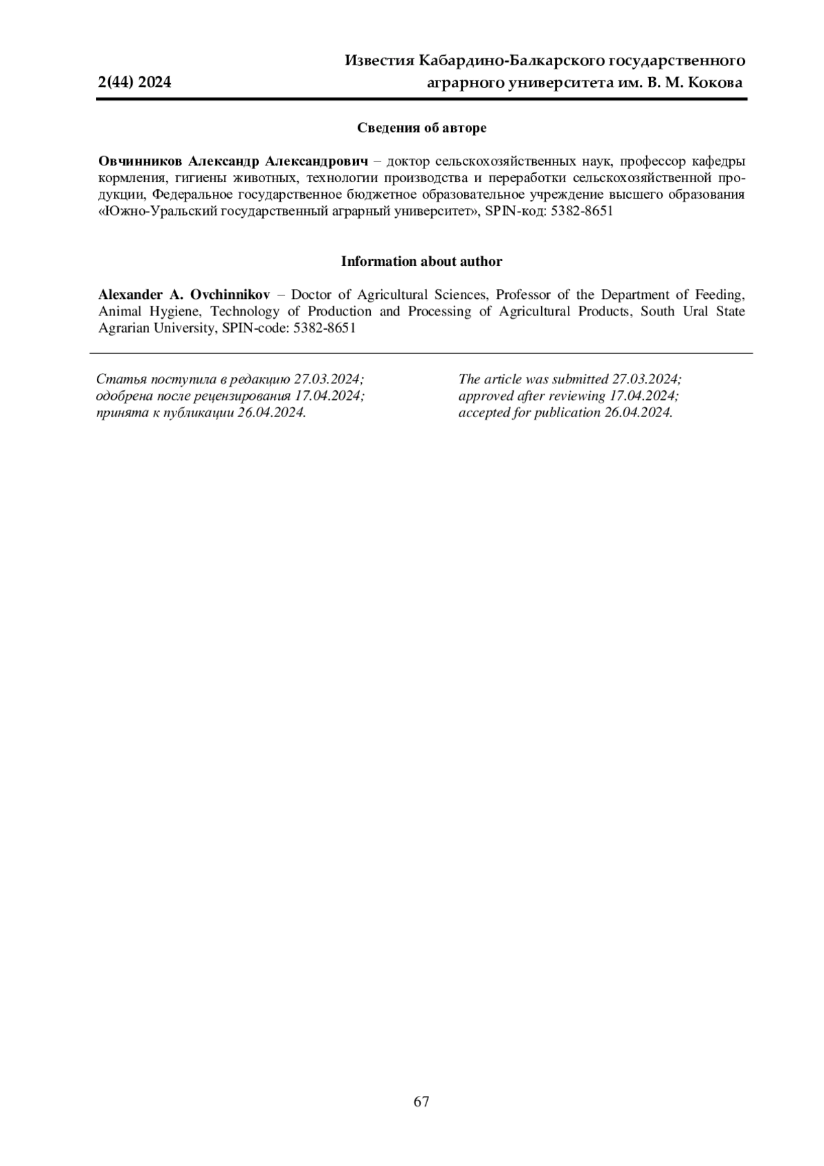 5. 	Овчинников А. А., Овчинникова Л. Ю., Лакомый А. А. Иммунобиохимические показатели крови цыплят-бройлеров при использовании биологически активных добавок в рационе // Кормление сельскохозяйственных животных и кормопроизводство. 2016. № 1. С. 39-44. EDN: VHDTAJ