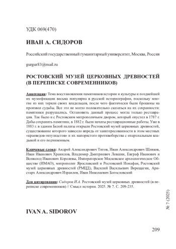 Тема восстановления памятников истории и культуры и позднейшей их музеефикации весьма популярна в русской историографии, поскольку многие из них теряли своих владельцев, после чего фактически были брошены на произвол судьбы. Все это не могло положительно сказаться на их сохранности: памятники разрушались. Остановить данный процесс могла только реставрация. Так было и с Ростовским митрополичьим двором, который опустел в 1787 г. Дабы сохранить памятник, в 1882 г. были начаты реставрационные работы. Уже в 1883 г. в здании Белой палаты открыли Ростовский музей церковных древностей, существование которого зависело впредь от заинтересованности в этом местных «краеведов-энтузиастов» и их напористого противоборства с епархиальным владыкой и его подчиненным.