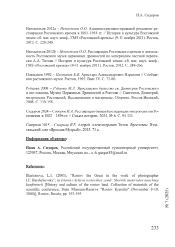 - Непоспехов 2012a – Непоспехов О.О. Административно-правовой регламент реставрации Ростовского кремля в 1883–1918 гг. // История и культура Ростовской земли: сб. мат. науч. конф., ГМЗ «Ростовский кремль» (9-11 ноября 2011). Ростов, 2012. С. 228-249.