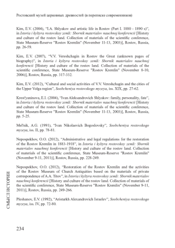 - Ким 2004 – Ким Е.В. И.А. Шляков и художественная жизнь в Ростове (Часть I. 1880-1890-е гг.) // История и культура ростовской земли: сб. мат. науч. конф., ГМЗ «Ростовский кремль» (11-13 ноября 2003). Ростов, 2004. C. 26-59.