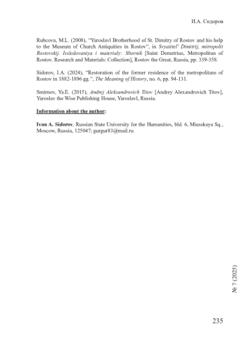 - Сидоров 2024 – Сидоров И.А. Реставрация бывшей резиденции митрополитов Ростовских в 1882 – 1896 гг. // Смысл истории. 2024. № 6. С. 94-131.