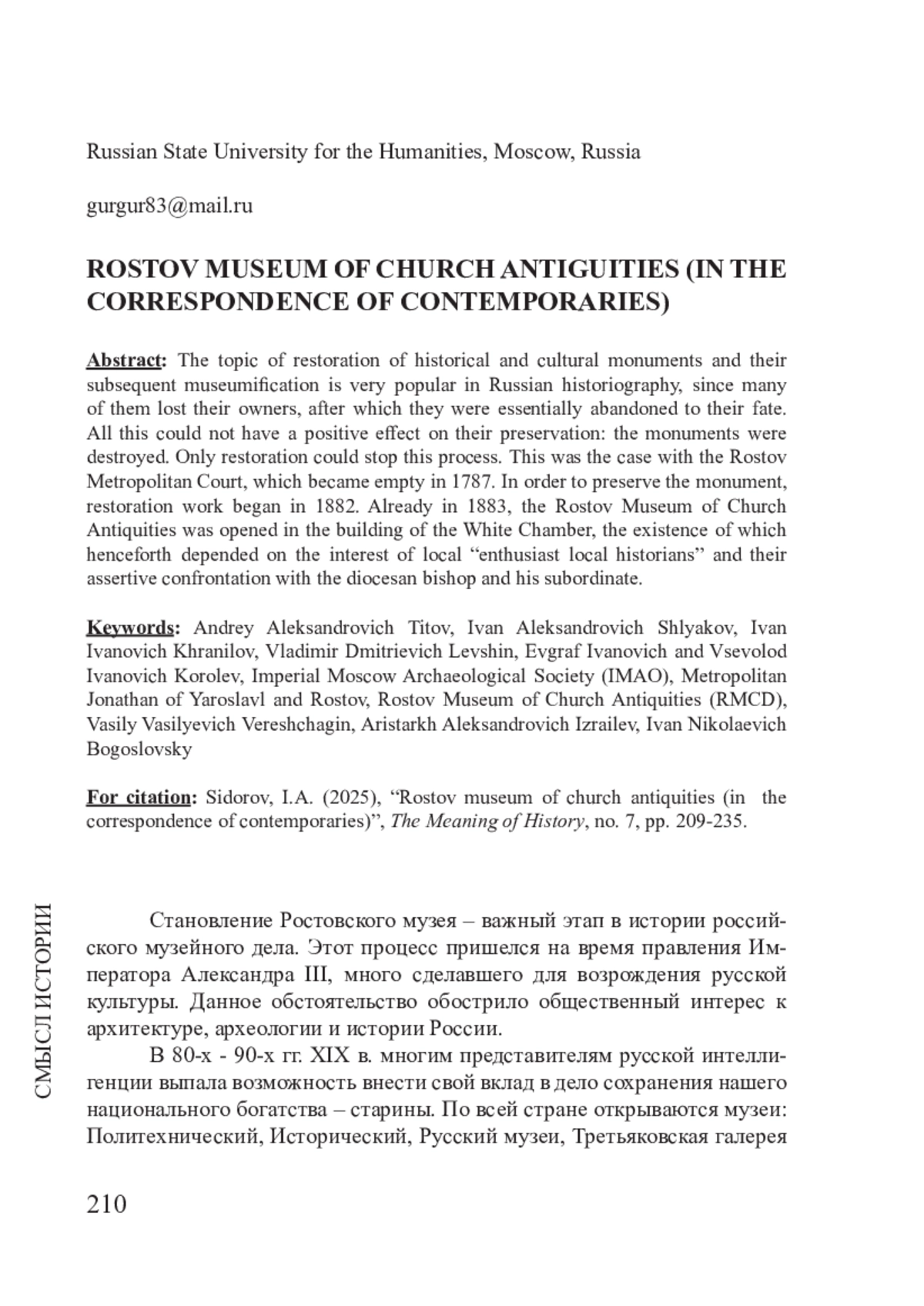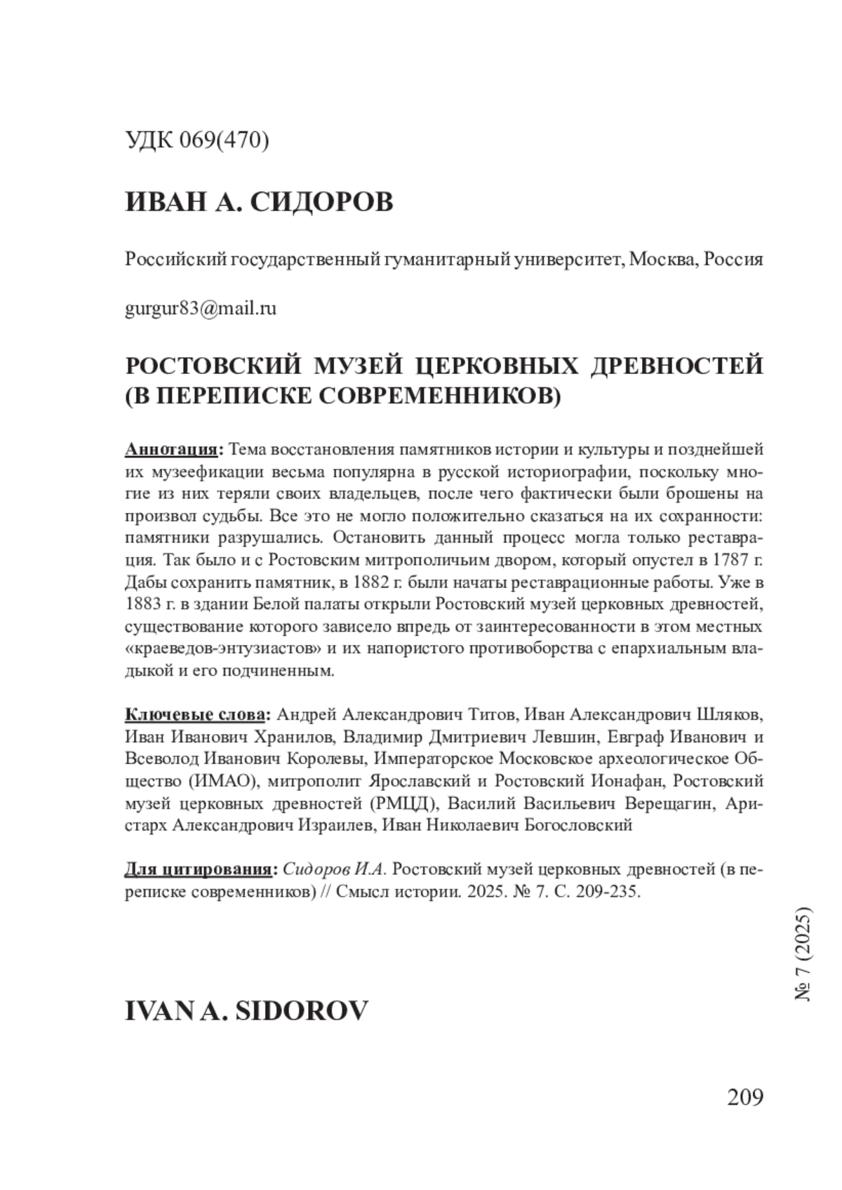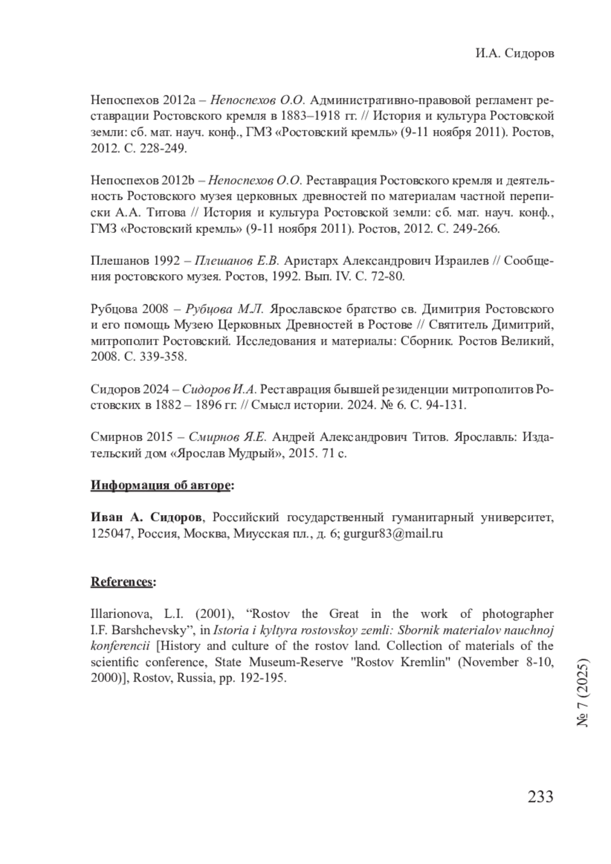 - Непоспехов 2012b – Непоспехов О.О. Реставрация Ростовского кремля и деятельность Ростовского музея церковных древностей по материалам частной переписки А.А. Титова // История и культура Ростовской земли: сб. мат. науч. конф., ГМЗ «Ростовский кремль» (9-11 ноября 2011). Ростов, 2012. С. 249-266.
