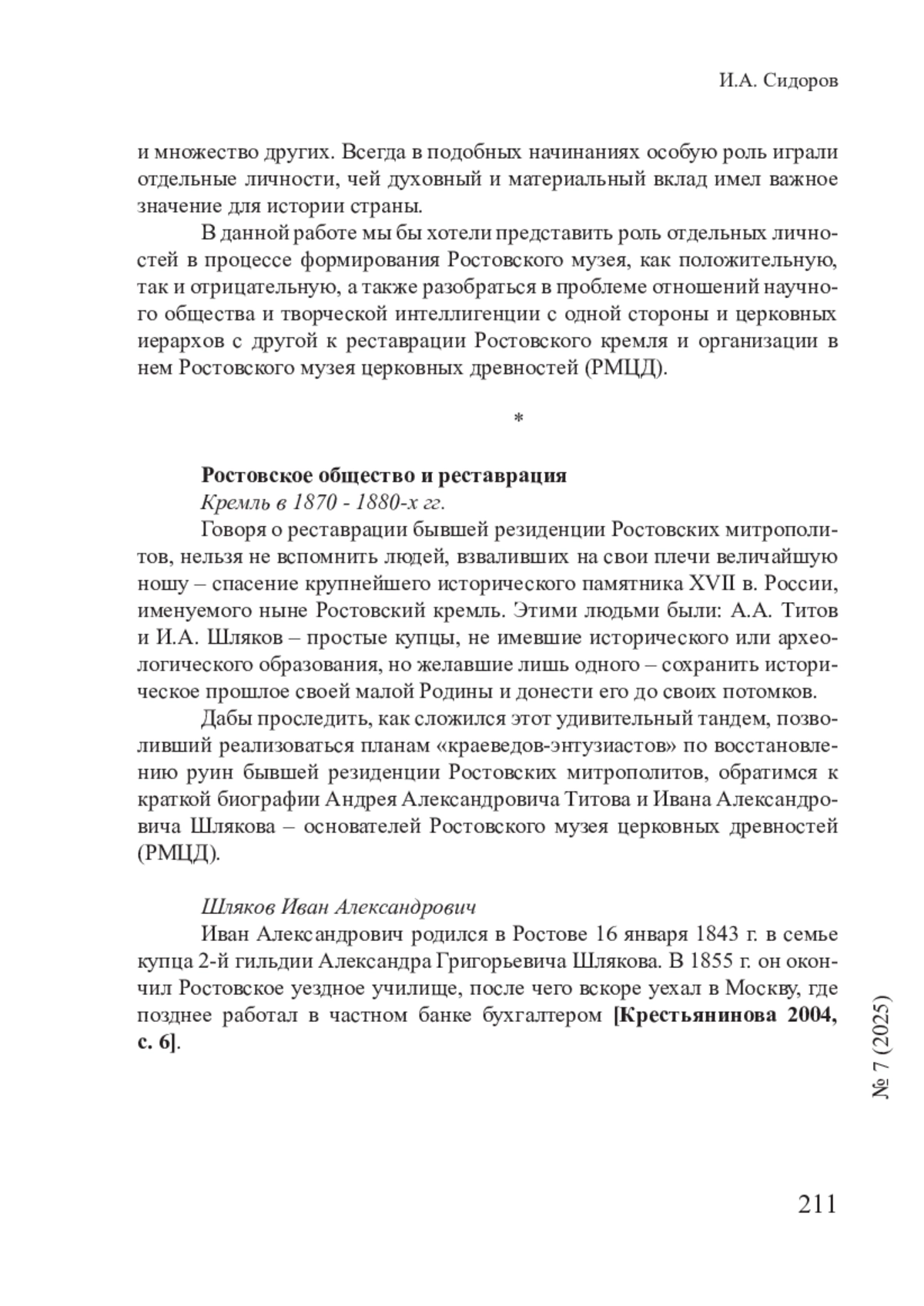 - Крестьянинова 2004 – Крестьянинова Е.И. Иван Александрович Шляков: род, личность, судьба // История и культура Ростовской земли: сб. мат. науч. конф., ГМЗ «Ростовский кремль» (11-13 ноября 2003). Ростов, 2004. С. 5-25.