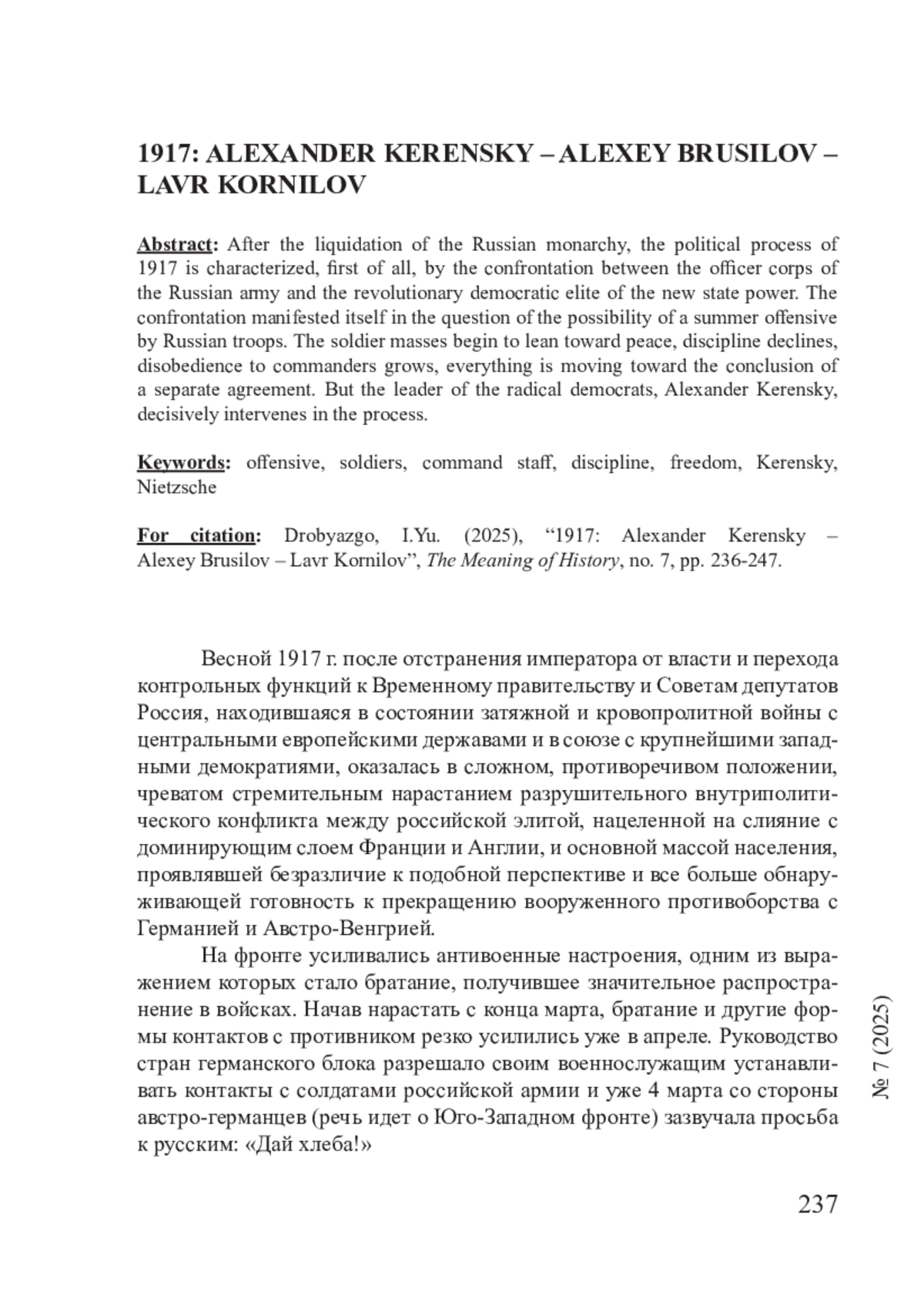 Весной 1917 г. после отстранения императора от власти и перехода контрольных функций к Временному правительству и Советам депутатов Россия, находившаяся в состоянии затяжной и кровопролитной войны с центральными европейскими державами и в союзе с крупнейшими западными демократиями, оказалась в сложном, противоречивом положении, чреватом стремительным нарастанием разрушительного внутриполитического конфликта между российской элитой, нацеленной на слияние с доминирующим слоем Франции и Англии, и основной массой населения, проявлявшей безразличие к подобной перспективе и все больше обнаруживающей готовность к прекращению вооруженного противоборства с Германией и Австро-Венгрией.