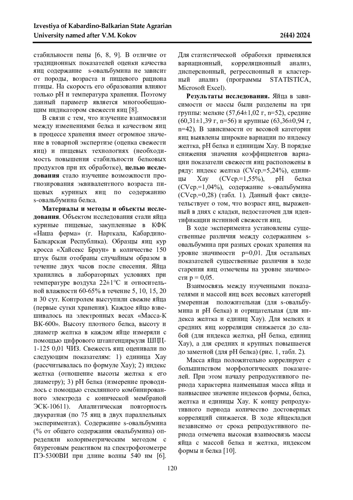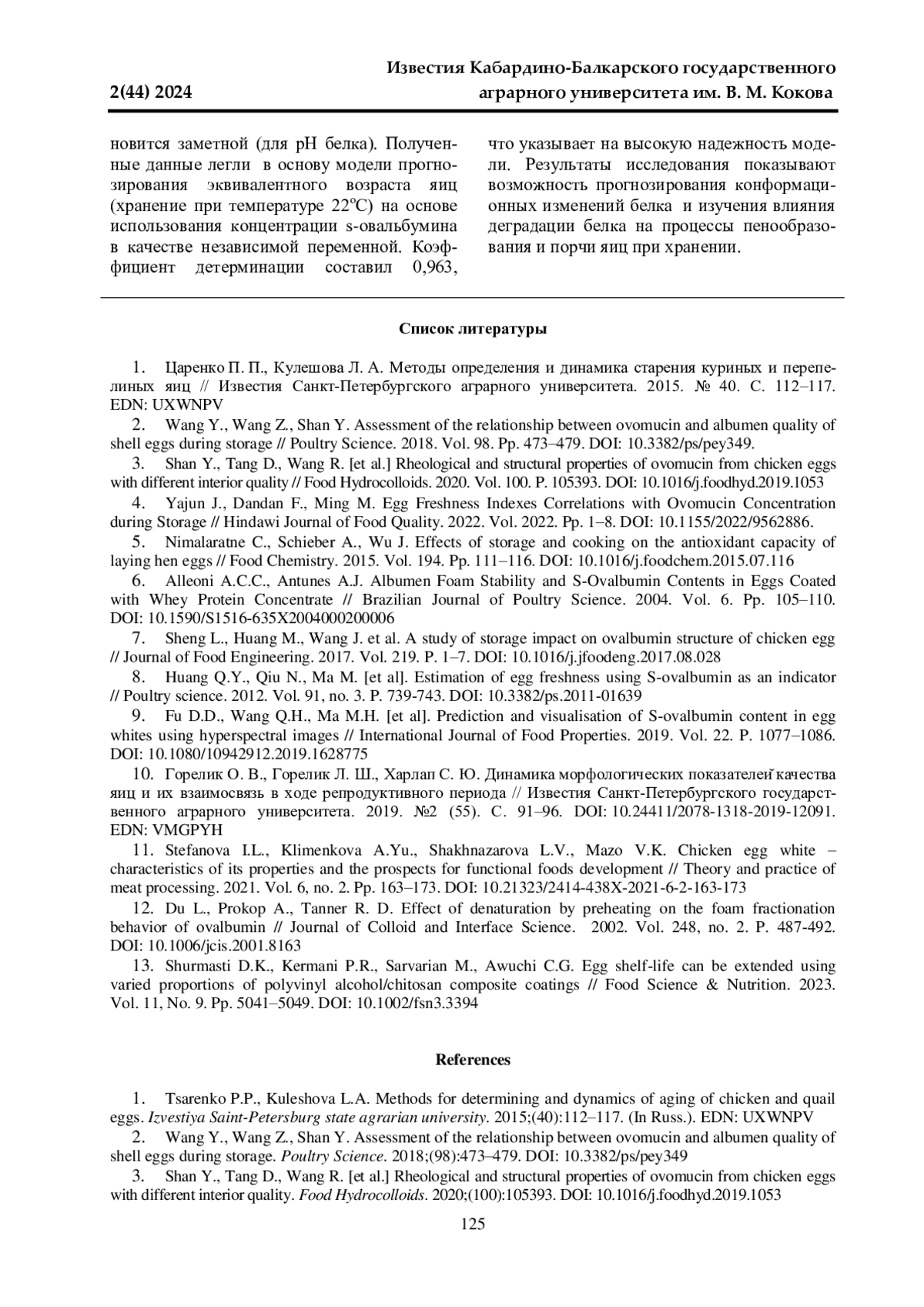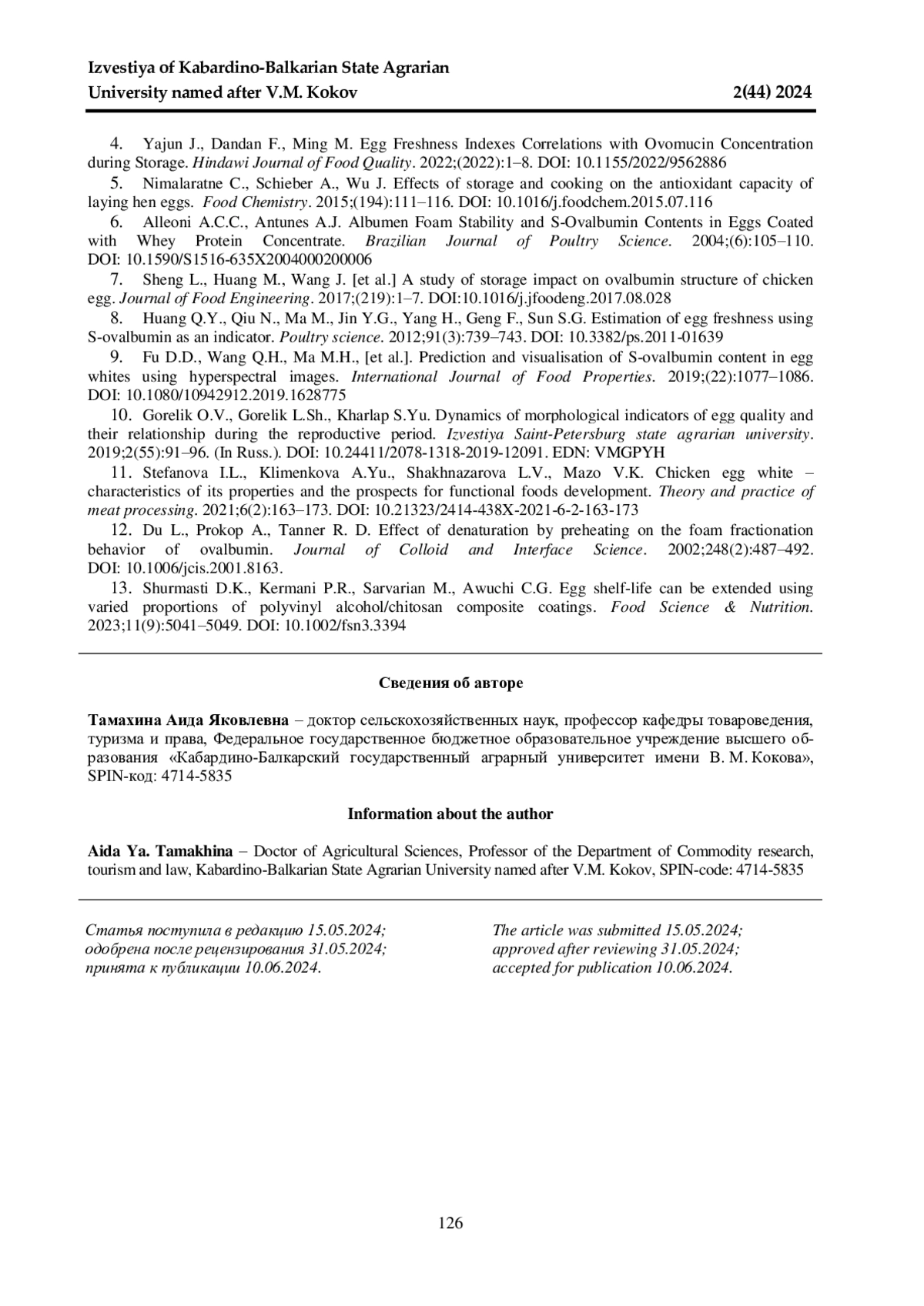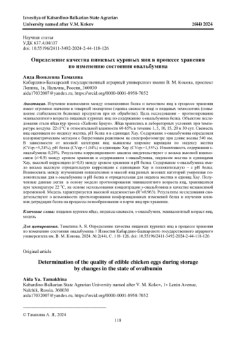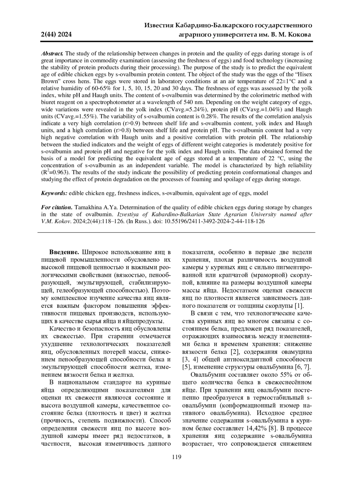 ТАМАХИНА А. Я. ОПРЕДЕЛЕНИЕ КАЧЕСТВА ПИЩЕВЫХ КУРИНЫХ ЯИЦ В ПРОЦЕССЕ ХРАНЕНИЯ ПО ИЗМЕНЕНИЮ СОСТОЯНИЯ ОВАЛЬБУМИНА // ИЗВЕСТИЯ КАБАРДИНО-БАЛКАРСКОГО ГОСУДАРСТВЕННОГО АГРАРНОГО УНИВЕРСИТЕТА ИМ. В. М. КОКОВА. 2024. № 2 (44)