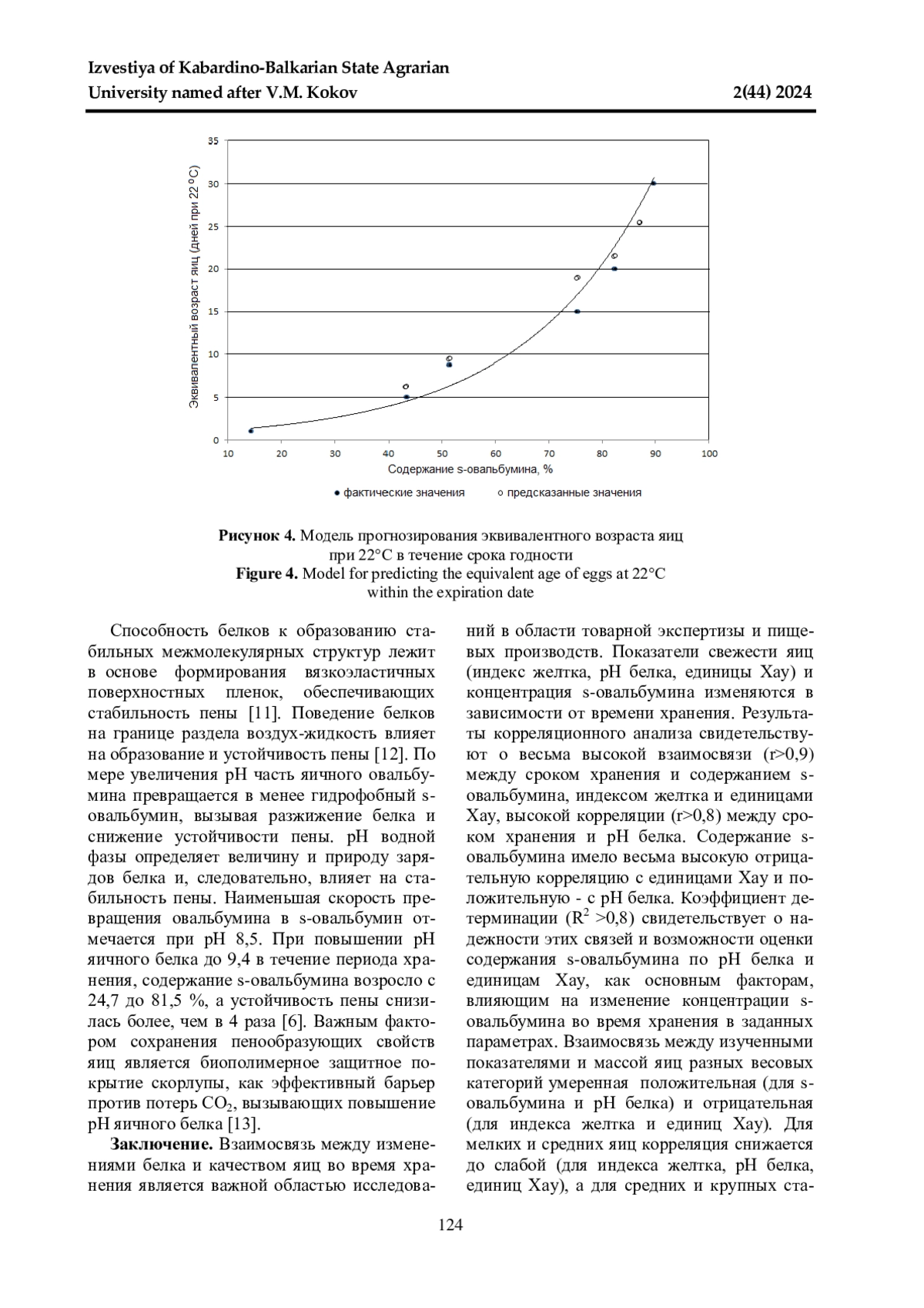Изучение взаимосвязи между изменениями белка и качеством яиц в процессе хранения имеет огромное значение в товарной экспертизе (оценка свежести яиц) и пищевых технологиях (повышение стабильности белковых продуктов при их обработке). Цель исследования - прогнозирование эквивалентного возраста пищевых куриных яиц по содержанию s-овальбумина белка. Объектом исследования стали яйца кур кросса «Хайсекс Браун». Яйца хранились в лабораторных условиях при температуре воздуха 22±1°С и относительной влажности 60-65% в течение 1, 5, 10, 15, 20 и 30 сут. Свежесть яиц оценивали по индексу желтка, рН белка и в единицах Хау. Содержание s-овальбумина определяли колориметрическим методом с биуретовым реактивом на спектрофотометре при длине волны 540 нм. В зависимости от весовой категории яиц выявлены широкие вариации по индексу желтка (CVср.=5,24%), рН белка (CVср.=1,04%) и единицам Хау (CVср.=1,55%). Изменчивость содержания sовальбумина 0,28%. Результаты корреляционного анализа свидетельствуют о весьма высокой взаимосвязи (r˃0.9) между сроком хранения и содержанием s-овальбумина, индексом желтка и единицами Хау, высокой корреляции (r˃0,8) между сроком хранения и рН белка. Содержание s-овальбумина имело весьма высокую отрицательную корреляцию с единицами Хау и положительную - с pH белка. Взаимосвязь между изученными показателями и массой яиц разных весовых категорий умеренная положительная для s-овальбумина и рН белка и отрицательная для индекса желтка и единиц Хау. Полученные данные легли в основу модели прогнозирования эквивалентного возраста яиц, хранившихся при температуре 22 оС, на основе использования концентрации s-овальбумина в качестве независимой переменной. Модель характеризуется высокой надежностью (R2 =0,963). Результаты исследования свидетельствуют о возможности прогнозирования конформационных изменений белка и изучения влияния деградации белка на процессы пенообразования и порчи яиц при хранении.