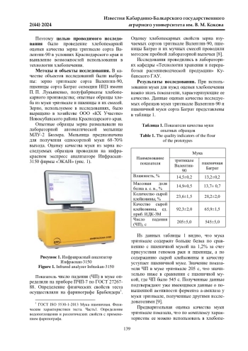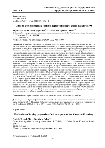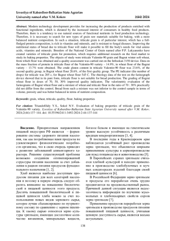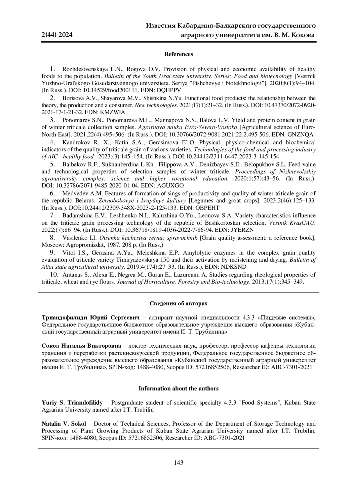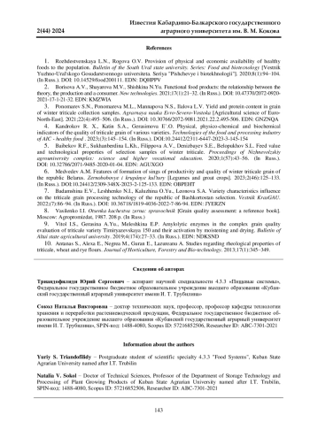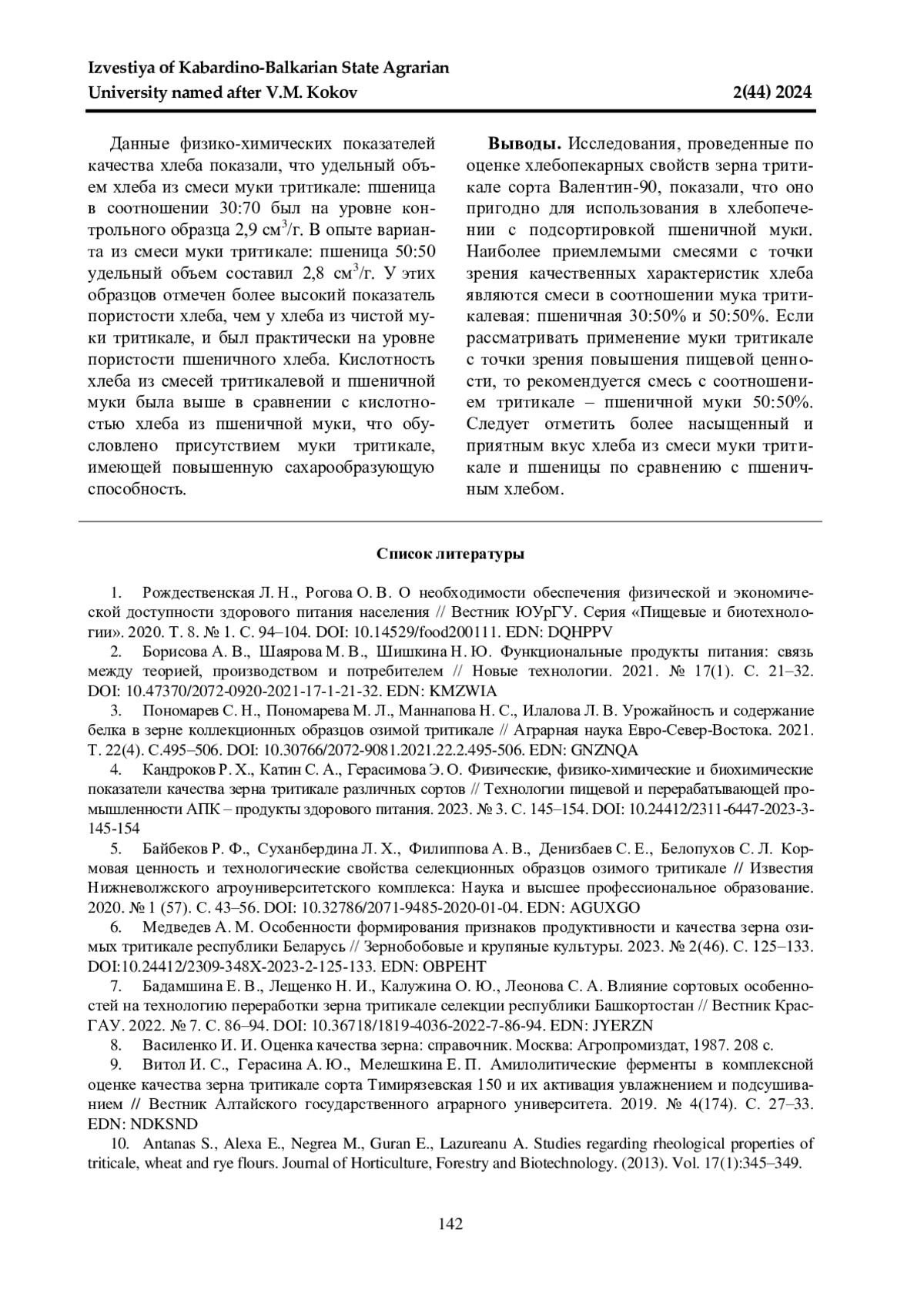 4. 	Кандроков Р. Х., Катин С. А., Герасимова Э. О. Физические, физико-химические и биохимические показатели качества зерна тритикале различных сортов // Технологии пищевой и перерабатывающей промышленности АПК - продукты здорового питания. 2023. № 3. С. 145-154. 10.24412/2311-6447-2023-3- 145-154. DOI: 10.24412/2311-6447-2023-3-145-154 EDN: IDWAVO
