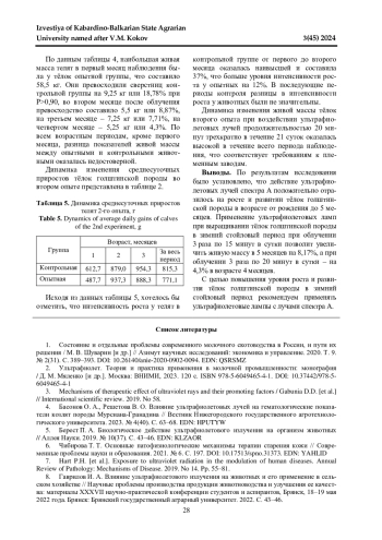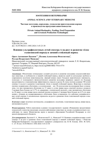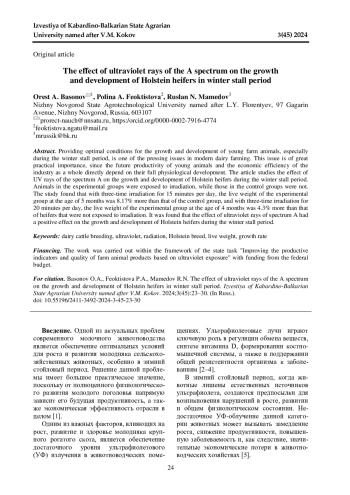 Обеспечение оптимальных условий для роста и развития молодняка сельскохозяйственных животных, в особенности в зимний стойловый период, является одной из актуальных проблем в современном молочном животноводстве. Данный вопрос имеет большую практическую значимость, поскольку от полноценного физиологического развития молодняка напрямую зависит его будущая продуктивность и экономическая эффективность отрасли в целом. В статье изучено влияние УФ-лучей спектра А на рост и развитие голштинских тѐлок в зимний стойловый период. Животные в опытных группах подвергались облучению, а в контрольных - нет. По результатам исследования было установлено, что при трехкратном облучении по 15 минут в сутки живая масса опытной группы в возрасте 5 месяцев была больше на 8,17% по сравнению с контрольной группой, а при трехкратном облучении по 20 минут в сутки живая масса опытной группы в возрасте 4 месяцев была больше на 4,3% по сравнению с тѐлками, не подвергавшимися к облучению. Было установлено, что действие ультрафиолетовых лучей спектра А положительно отразилось на росте и развитии тѐлок голштинской породы в зимний стойловый период.