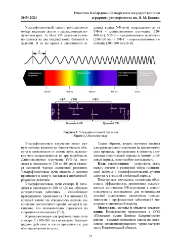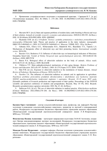 8. Гаврилов И. А. Влияние ультрафиолетового излучения на животных и его применение в сельском хозяйстве // Научные проблемы производства продукции животноводства и улучшения ее качества: материалы XXXVII научно-практической конференции студентов и аспирантов, Брянск, 18-19 мая 2022 года. Брянск: Брянский государственный аграрный университет. 2022. С. 43-46. EDN: SQDOLE