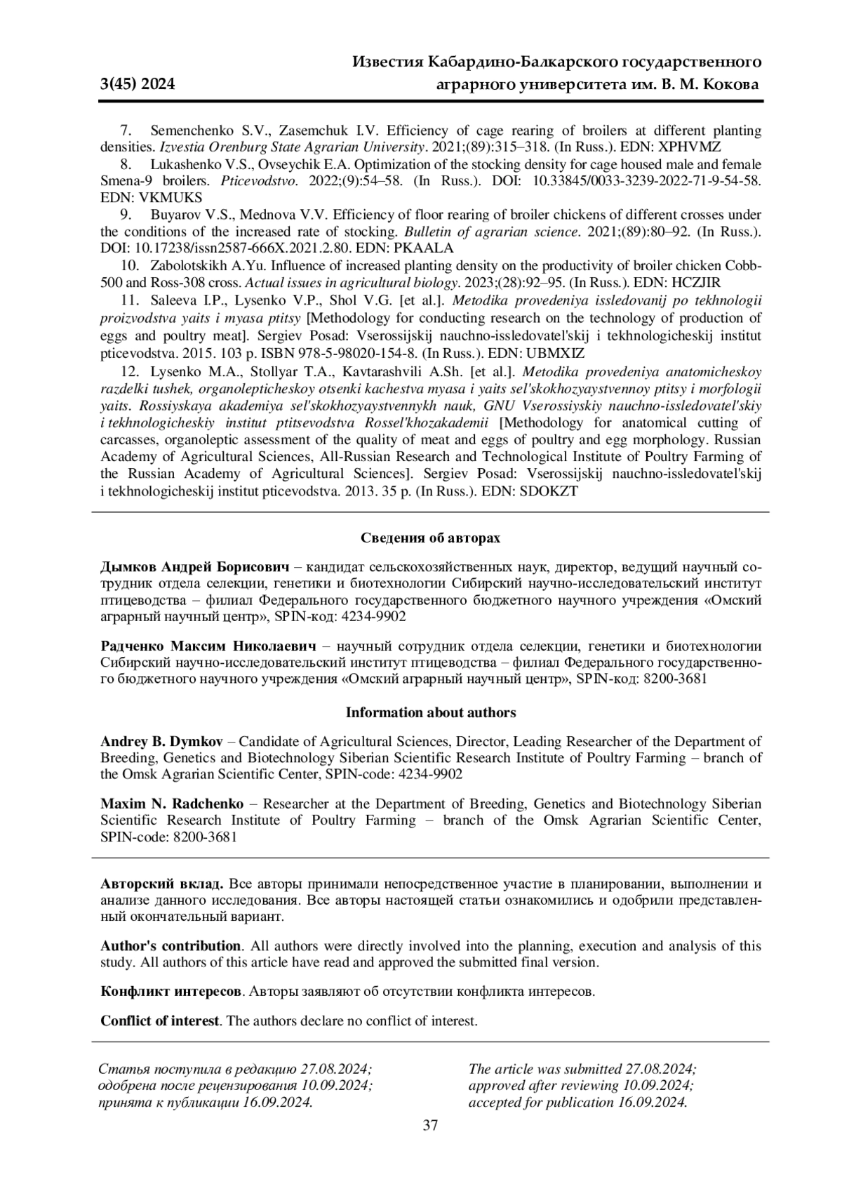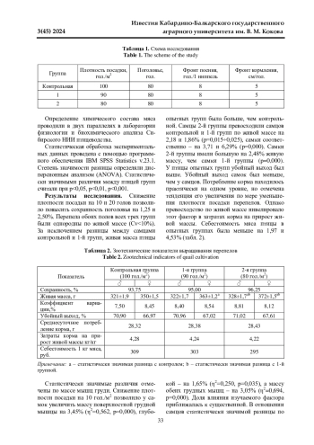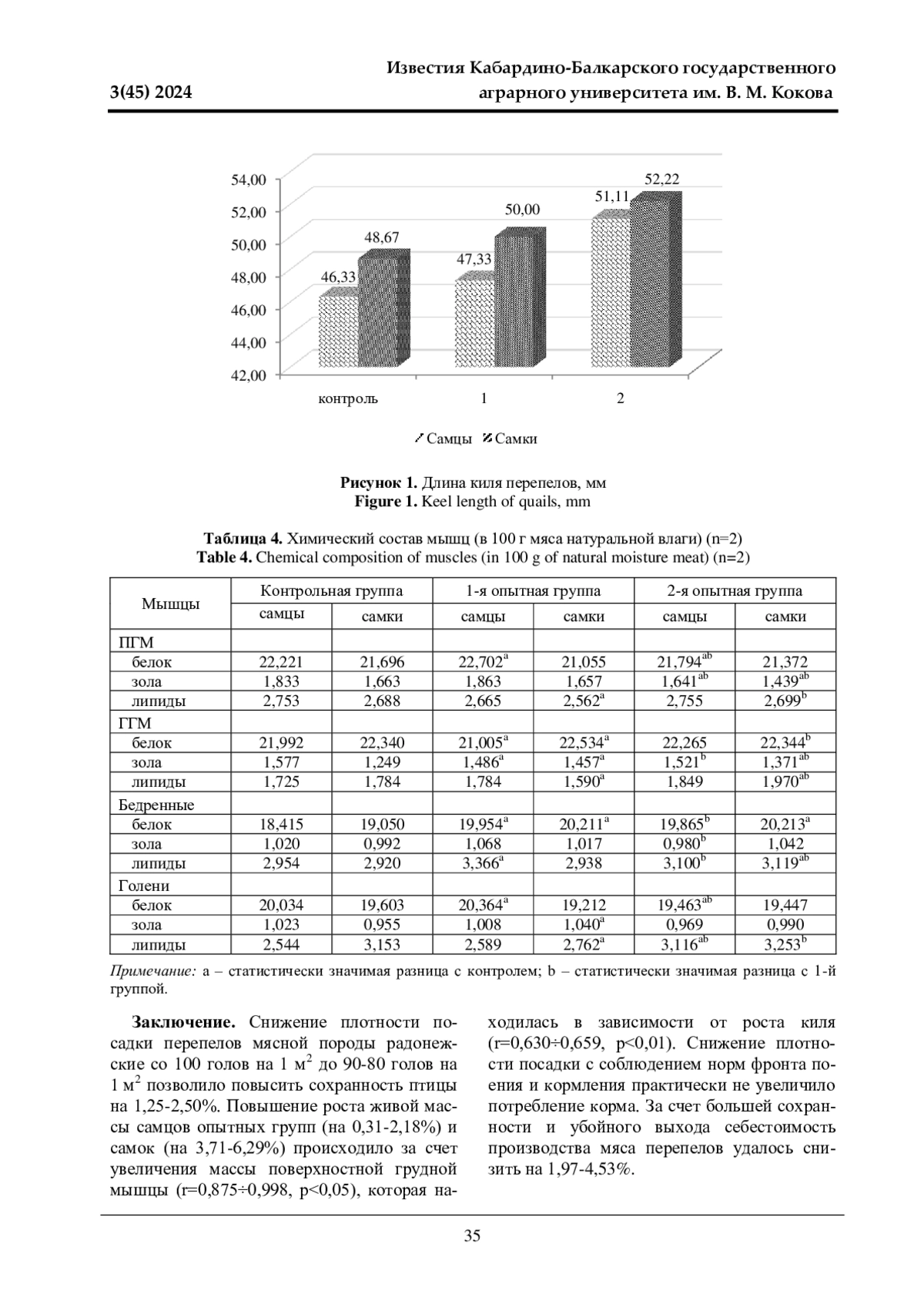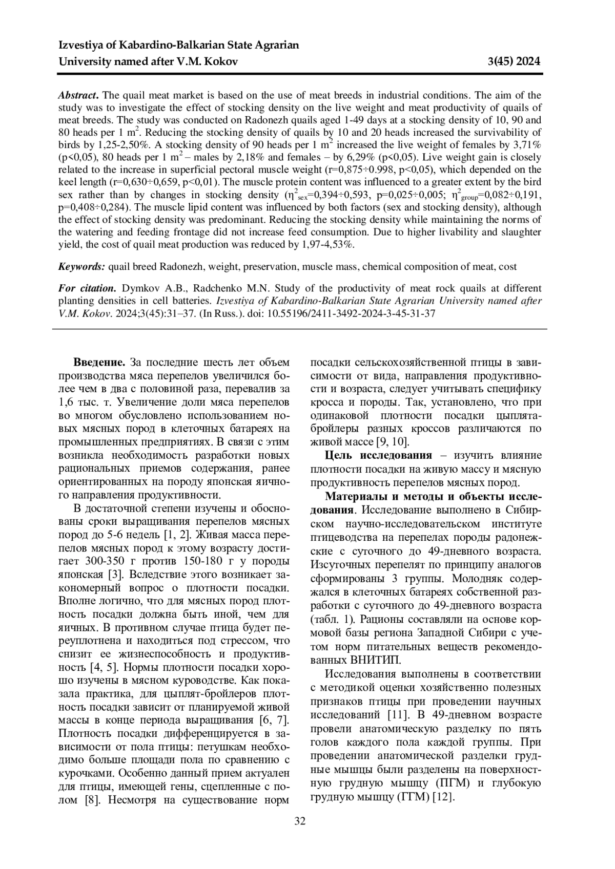 Статья: ИЗУЧЕНИЕ ПРОДУКТИВНОСТИ ПЕРЕПЕЛОВ МЯСНОЙ ПОРОДЫ ПРИ РАЗНОЙ ПЛОТНОСТИ ПОСАДКИ В КЛЕТОЧНЫХ БАТАРЕЯХ (2024)