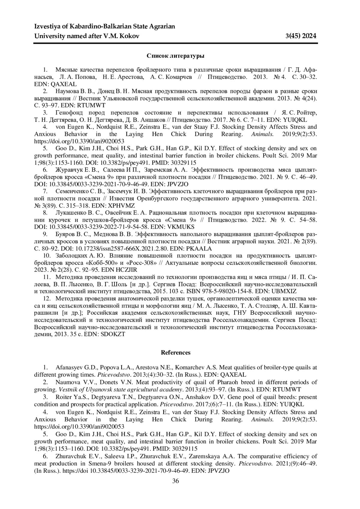 ДЫМКОВ А. Б., РАДЧЕНКО М. Н. ИЗУЧЕНИЕ ПРОДУКТИВНОСТИ ПЕРЕПЕЛОВ МЯСНОЙ ПОРОДЫ ПРИ РАЗНОЙ ПЛОТНОСТИ ПОСАДКИ В КЛЕТОЧНЫХ БАТАРЕЯХ // ИЗВЕСТИЯ КАБАРДИНО-БАЛКАРСКОГО ГОСУДАРСТВЕННОГО АГРАРНОГО УНИВЕРСИТЕТА ИМ. В. М. КОКОВА. 2024. № 3 (45)
