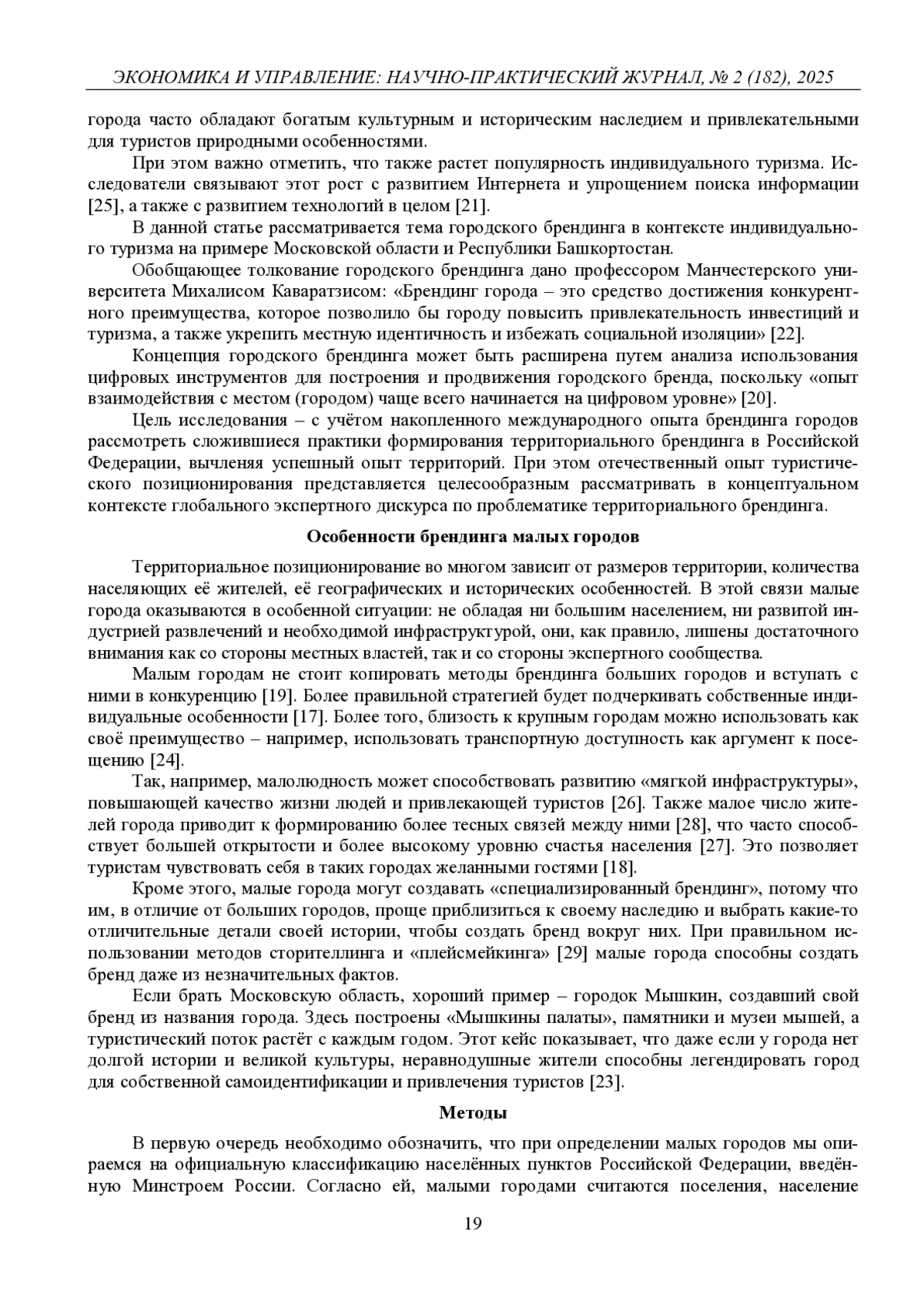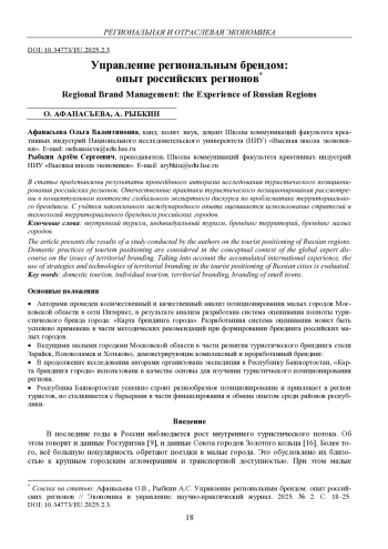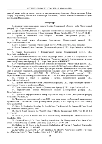 2. 	Афанасьева О.В., Рыбкин А.С. Брендинг территорий как инструмент привлечения туристов в малые города Подмосковья // Коммуникации. Медиа. Дизайн. 2024. Т. 9. № 4. С. 34-48.  EDN: WKZYUH