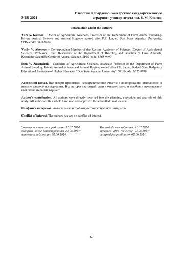 КОЛОСОВ Ю. А., АБОНЕЕВ В. В., ЗАСЕМЧУК И. В. УРОВЕНЬ ВЗАИМОСВЯЗЕЙ МЕЖДУ ПРИЗНАКАМИ ПРОДУКТИВНОСТИ У ОВЕЦ ПОРОДЫ СОВЕТСКИЙ МЕРИНОС И ИХ ПОМЕСЕЙ СО СТАВРОПОЛЬСКОЙ ПОРОДОЙ // ИЗВЕСТИЯ КАБАРДИНО-БАЛКАРСКОГО ГОСУДАРСТВЕННОГО АГРАРНОГО УНИВЕРСИТЕТА ИМ. В. М. КОКОВА. 2024. № 3 (45)