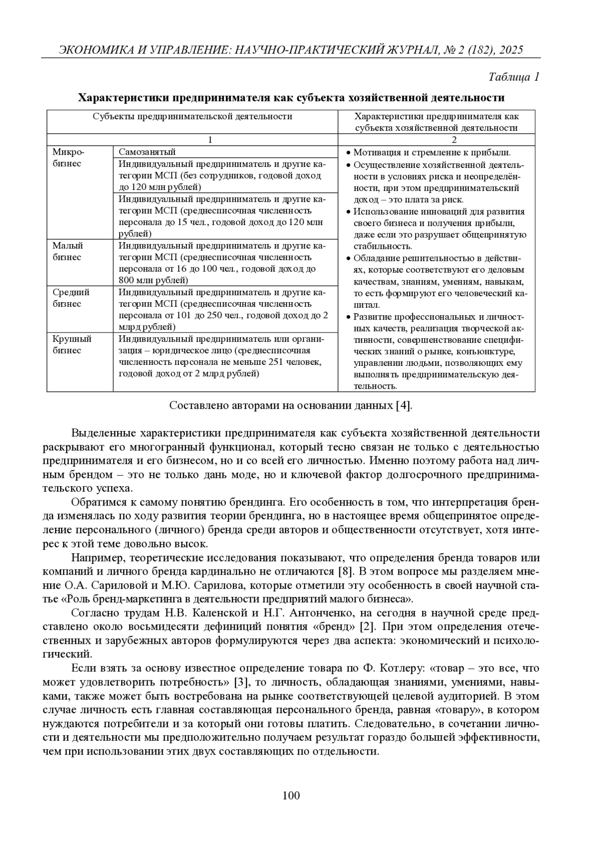 НАЗАРОВА У. А., ПОДГОРНАЯ Т. Ю. ПЕРСОНАЛЬНЫЙ БРЕНД ПРЕДПРИНИМАТЕЛЯ КАК ЭЛЕМЕНТ МАРКЕТИНГОВОЙ СТРАТЕГИИ ОРГАНИЗАЦИЙ МАЛОГО И СРЕДНЕГО БИЗНЕСА // ЭКОНОМИКА И УПРАВЛЕНИЕ: НАУЧНО-ПРАКТИЧЕСКИЙ ЖУРНАЛ. 2025. № 2 (182)