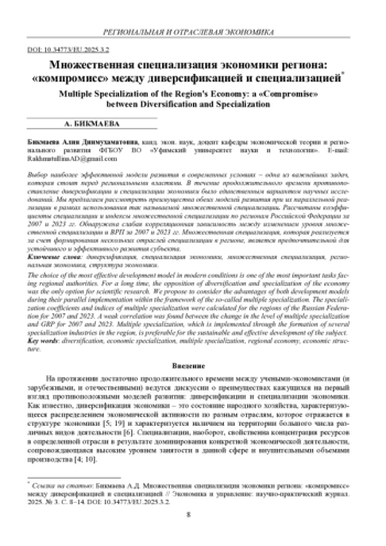2. 	Бикмаева А.Д. Специализация экономики региона: теоретические и практические аспекты // Экономика и управление: научно-практический журнал. 2024. № 5(179). С. 74-79.  DOI: 10.34773/EU.2024.5.12