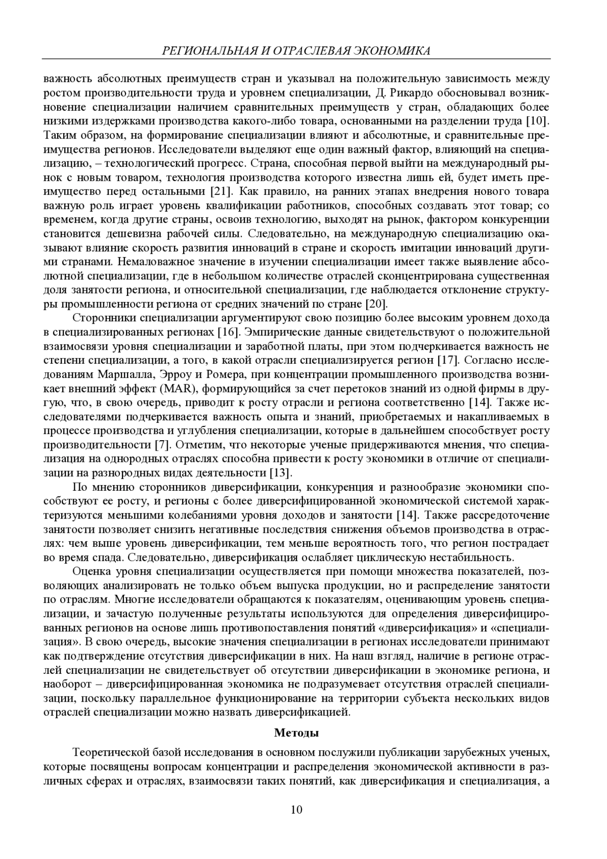 На протяжении достаточно продолжительного времени между учеными-экономистами (и зарубежными, и отечественными) ведутся дискуссии о преимуществах кажущихся на первый взгляд противоположными моделей развития: диверсификации и специализации экономики. Как известно, диверсификация экономики – это состояние народного хозяйства, характеризующееся распределением экономической активности по разным отраслям, которое отражается в структуре экономики [5; 19] и характеризуется наличием на территории большого числа различных видов деятельности [6]. Специализации, наоборот, свойственна концентрация ресурсов в определенной отрасли в результате доминирования конкретной экономической деятельности, сопровождающаяся высоким уровнем занятости в данной сфере и внушительными объемами производства