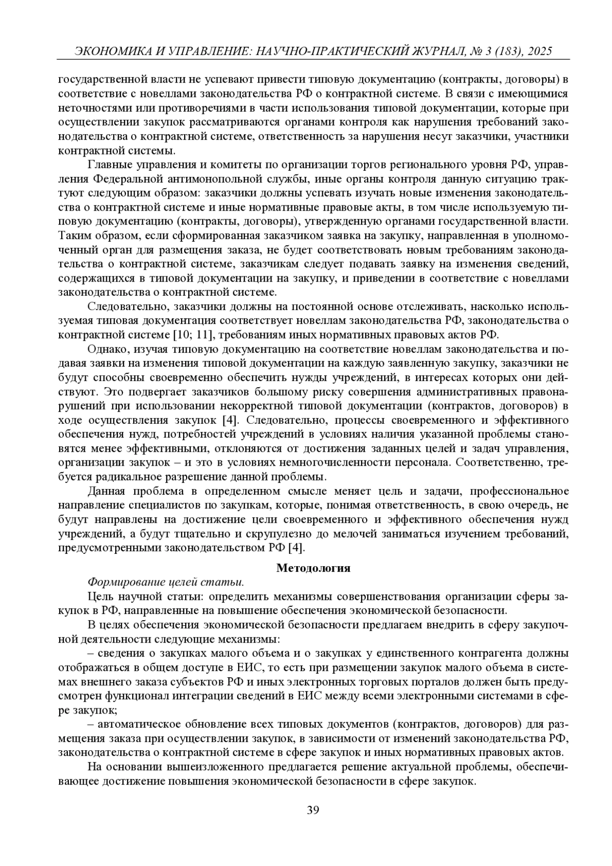 В научной статье рассматриваются актуальные вопросы по обеспечению экономической безопасности в сфере закупок в Российской Федерации. Эффективность экономической безопасности в сфере закупок обеспечивается за счет создания условий открытости и прозрачности сведений по осуществлению конкурентных закупок, в том числе закупок малого объема, закупок у единственного контрагента. Сведения о закупках в ближайшей перспективе должны отображаться в общем доступе на едином информационном ресурсе в Единой информационной системе (далее – ЕИС), что позволит обеспечивать конкурентоспособность, будет соответствовать новым реалиям цифровизации, требованиям экономической политики страны, антикоррупционной составляющей, способствовать внедрению механизмов, обеспечивающих эффективность закупочной деятельности и экономическую безопасность управления в сфере закупок
