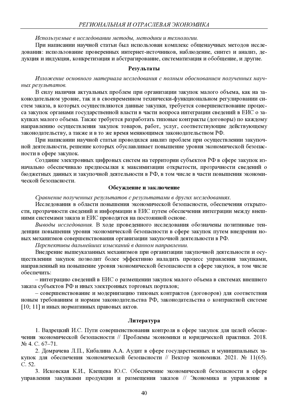 2. 	Домрачева Л.П., Кибалина А.А. Аудит в сфере государственных и муниципальных закупок для обеспечения экономической безопасности // Вектор экономики. 2021. № 11(65). С. 52.  EDN: FHOAYB