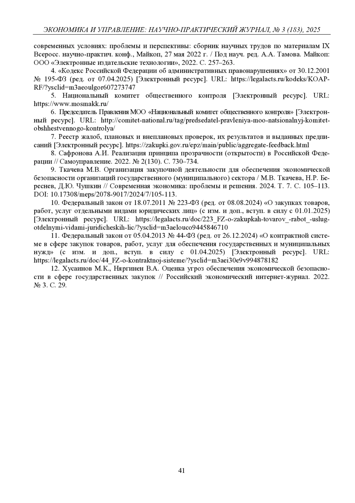 12. 	Хусаинов М.К., Няргинен В.А. Оценка угроз обеспечения экономической безопасности в сфере государственных закупок // Российский экономический интернет-журнал. 2022. № 3. С. 29.  EDN: POENTI