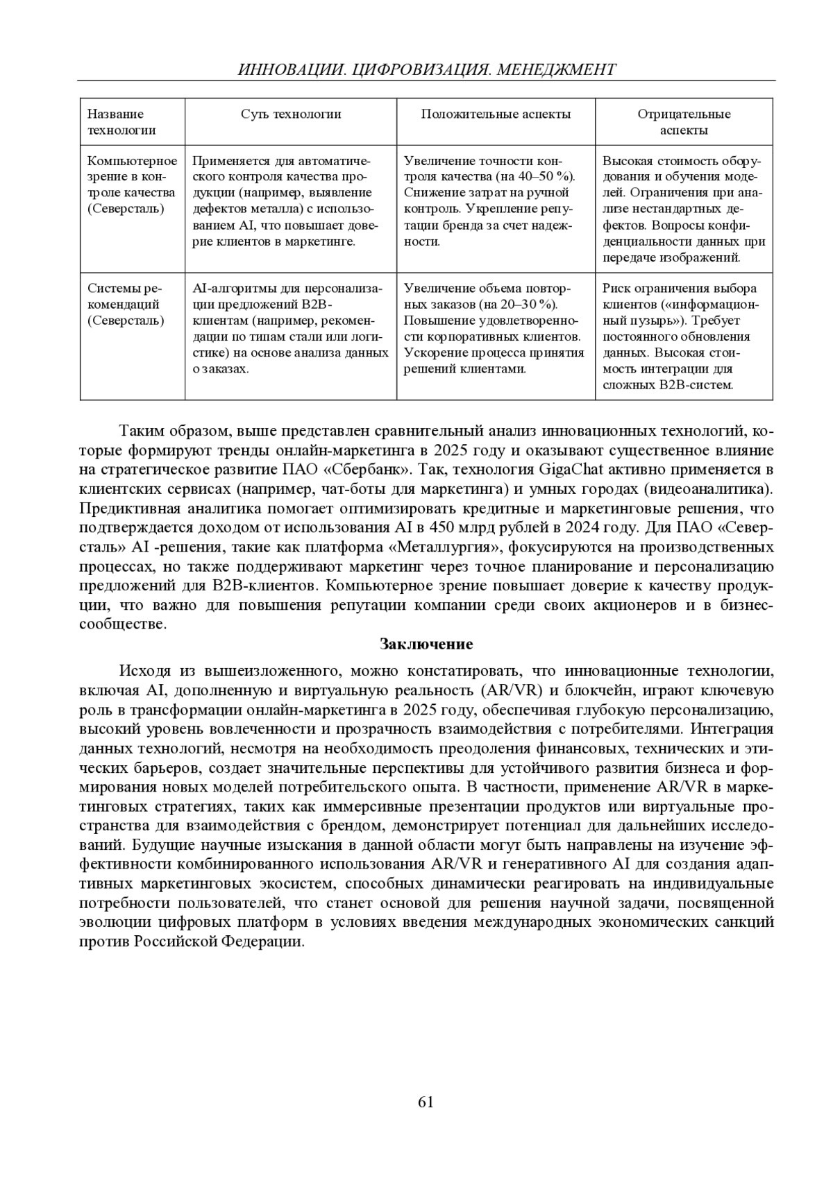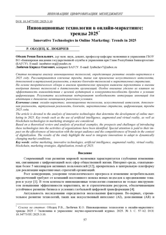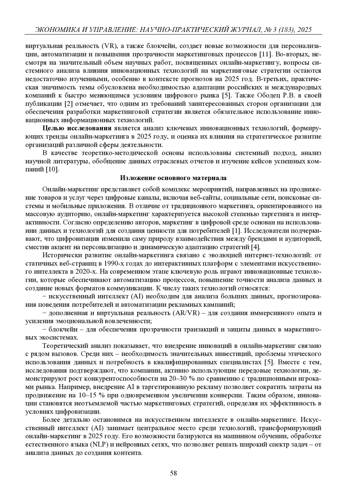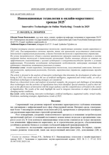 Статья посвящена анализу инновационных технологий, определяющих развитие онлайн-маркетинга в 2025 году. Рассматриваются ключевые тренды, такие как применение искусственного интеллекта, дополненной и виртуальной реальности, а также блокчейн-технологий в маркетинговых стратегиях. На основе теоретического обзора и анализа практических примеров выявлены перспективы и вызовы внедрения данных технологий в деятельность организаций. Особое внимание уделено их влиянию на эффективность взаимодействия с целевой аудиторией и конкурентоспособность брендов в условиях цифровизации. Результаты исследования подчеркивают необходимость интеграции инноваций для адаптации к динамично меняющимся рыночным условиям