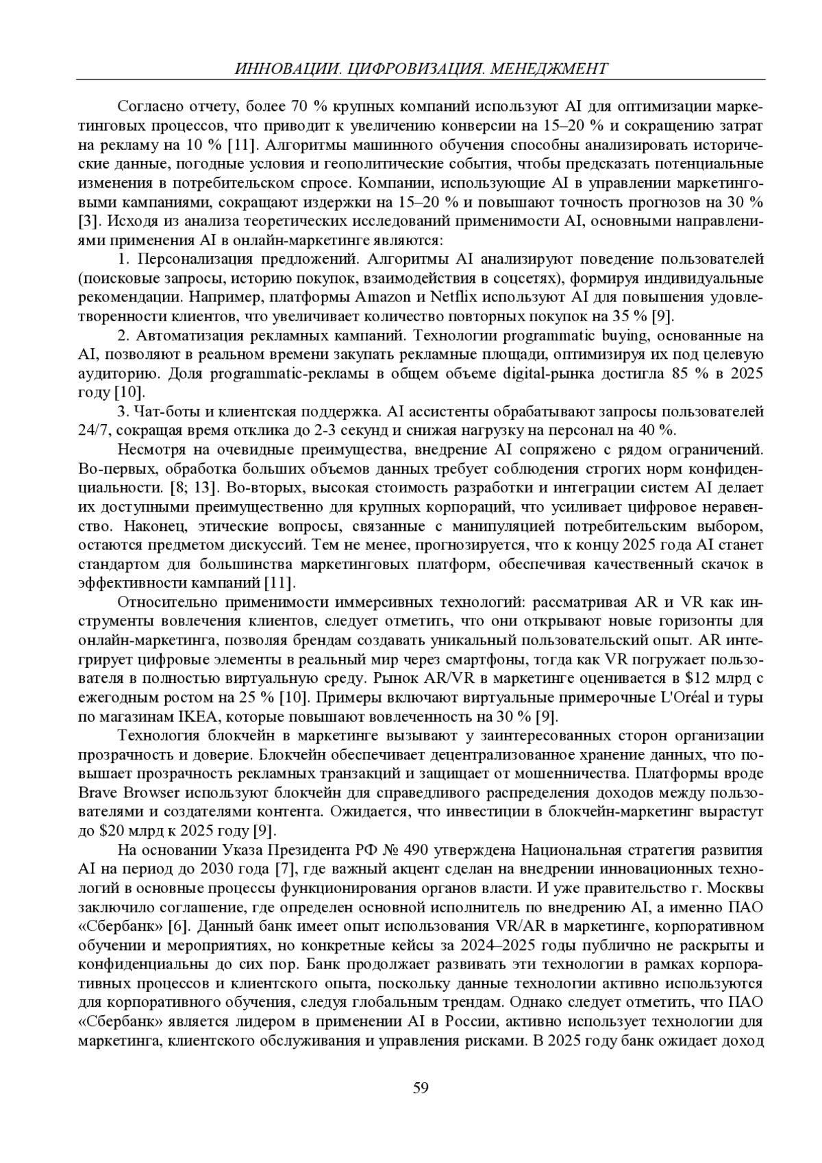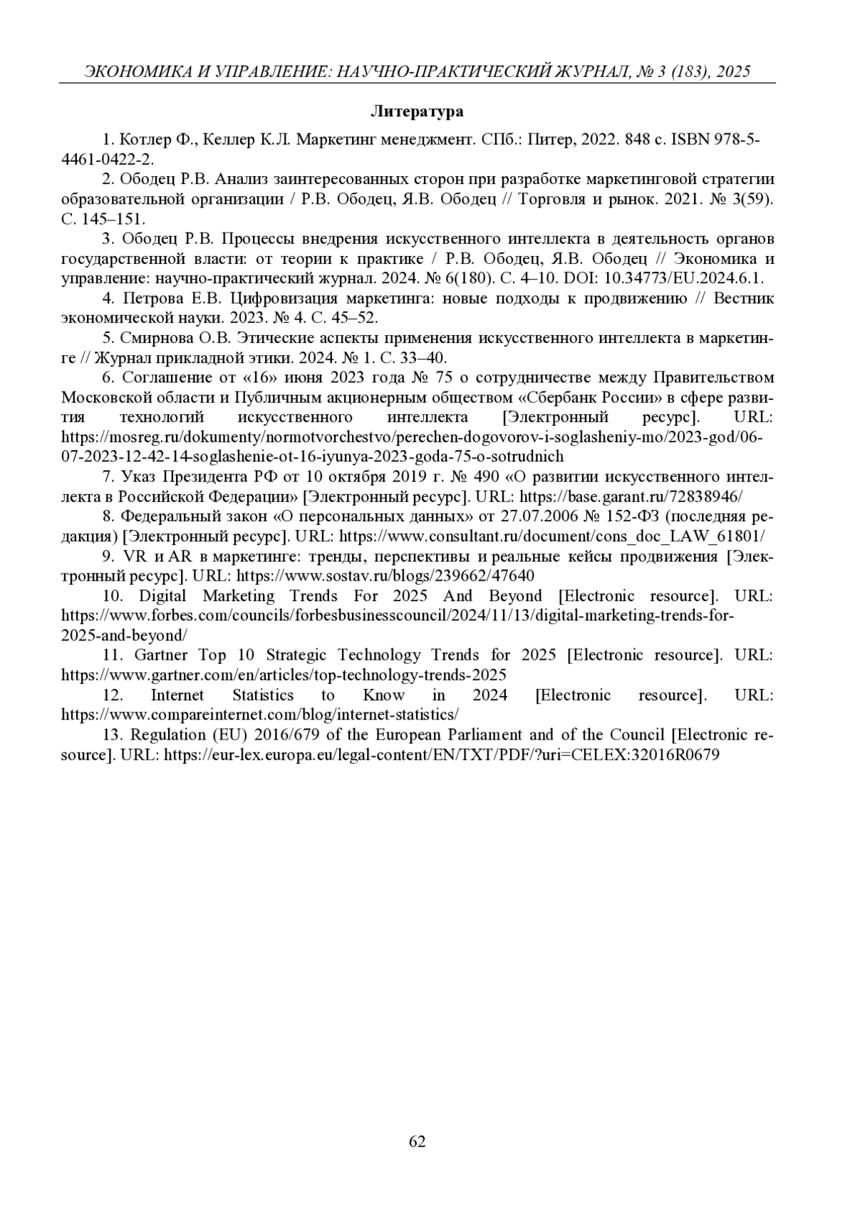 5. 	Смирнова О.В. Этические аспекты применения искусственного интеллекта в маркетинге // Журнал прикладной этики. 2024. № 1. С. 33-40.