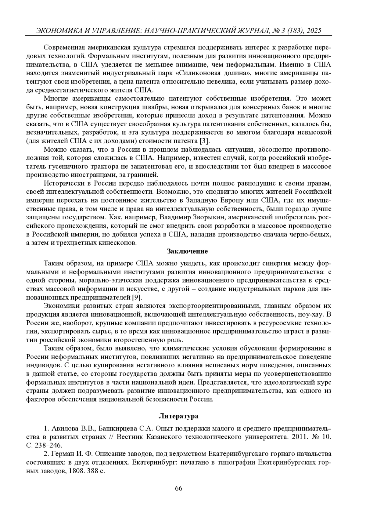 1. 	Авилова В.В., Башкирцева С.А. Опыт поддержки малого и среднего предпринимательства в развитых странах // Вестник Казанского технологического университета. 2011. № 10. С. 238-246.  EDN: NXAJCH