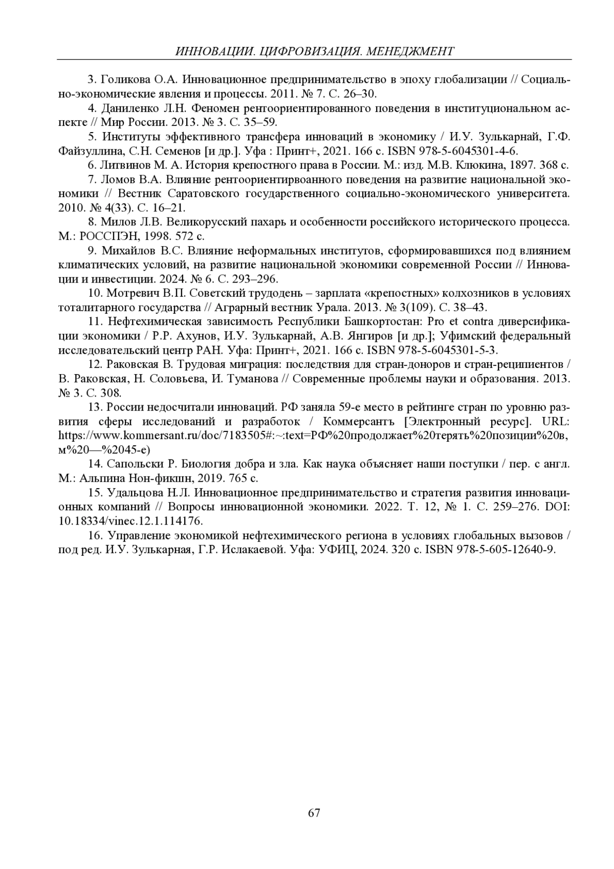 4. 	Даниленко Л.Н. Феномен рентоориентированного поведения в институциональном аспекте // Мир России. 2013. № 3. С. 35-59.