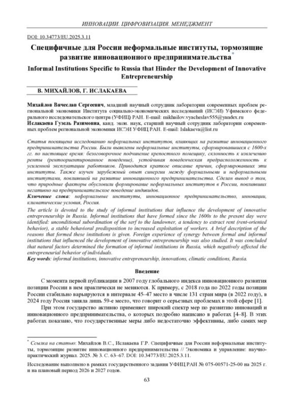 Статья посвящена исследованию неформальных институтов, влияющих на развитие инновационного предпринимательства России. Были выявлены неформальные институты, сформировавшиеся c 1600-х гг. по настоящее время: безоговорочное подчинение крепостного помещику, склонность к извлечению ренты (рентоориентированное поведение), устойчивая поведенческая предрасположенность к усиленной эксплуатации работников. Приводится краткое описание причин, сформировавших эти институты. Также изучен зарубежный опыт синергии между формальными и неформальными институтами, повлиявшей на развитие инновационного предпринимательства. Сделан вывод о том, что природные факторы обусловили формирование неформальных институтов в России, повлиявших негативно на предпринимательское поведение индивидов