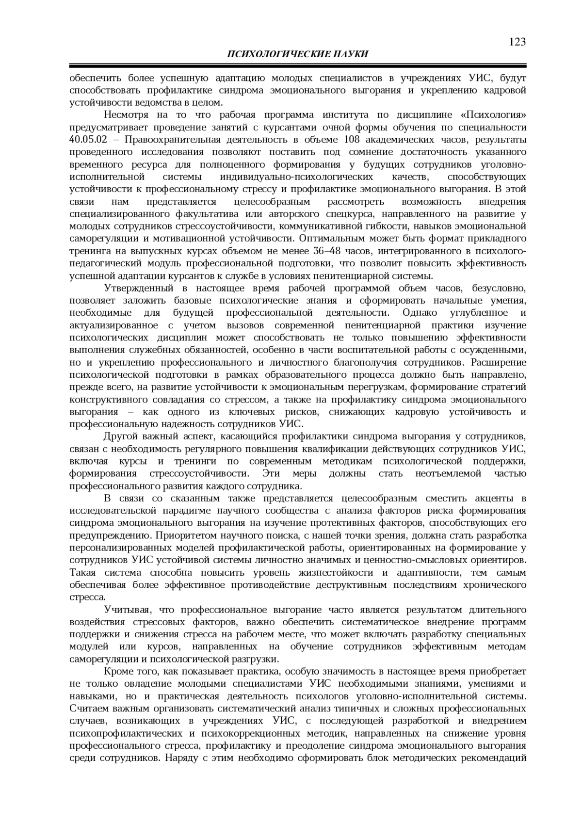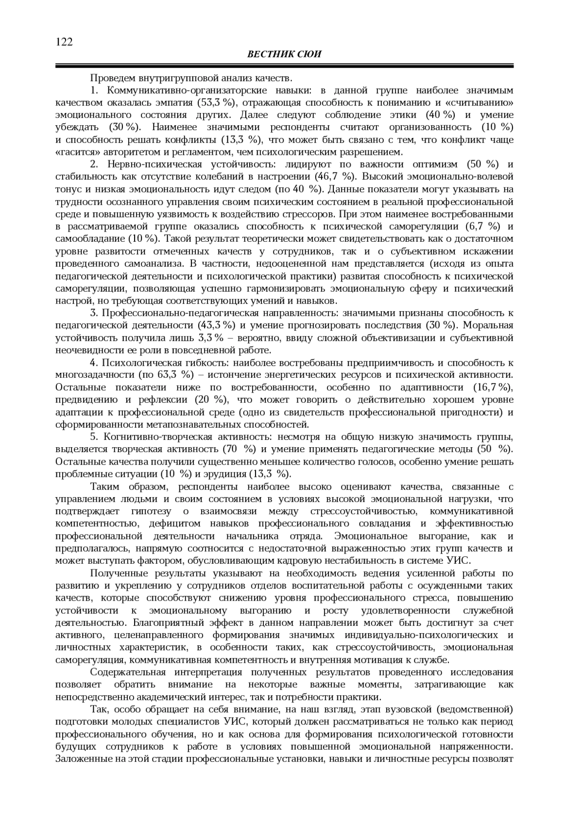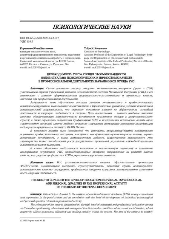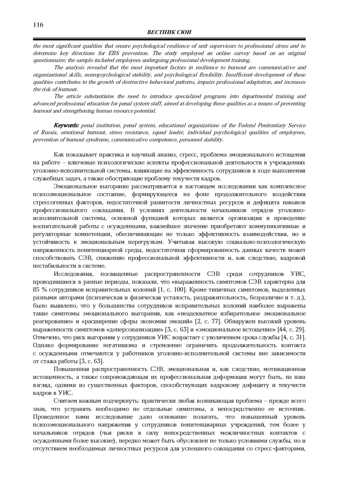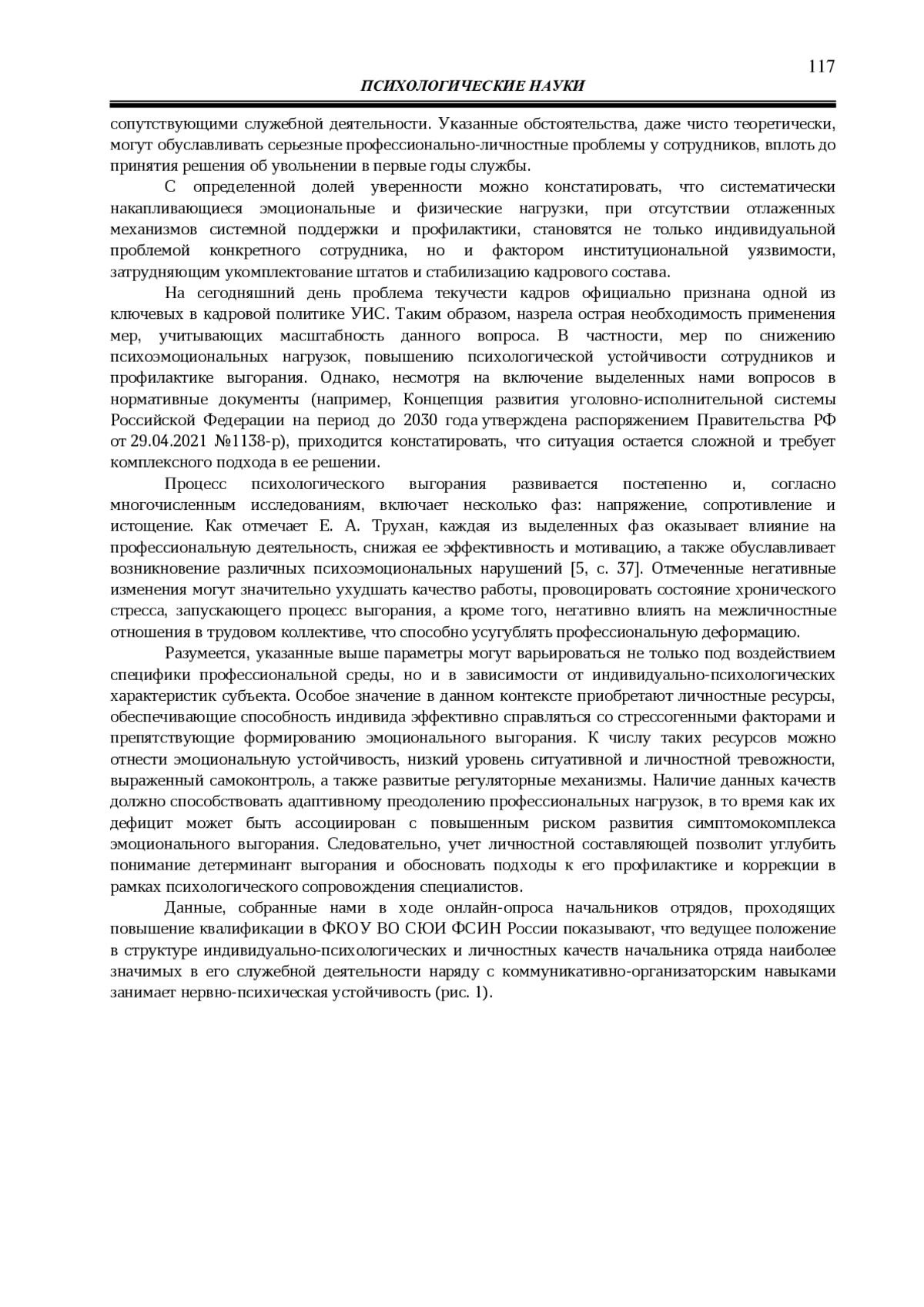 Актуальность темы обусловлена высоким уровнем эмоционального и профессионального истощения сотрудников, выполняющих воспитательные и управленческие функции в условиях повышенной психологической напряженности, что оказывает негативное влияние на эффективность служебной деятельности и кадровую стабильность в системе. Цель исследования - выявить наиболее значимые качества, обеспечивающие психологическую устойчивость начальников отрядов к профессиональному стрессу, а также определить направления профилактики СЭВ. В исследовании использован онлайн-опрос с применением авторской анкеты; выборку составили сотрудники, проходящие повышение квалификации в Самарском юридическом институте ФСИН России.
