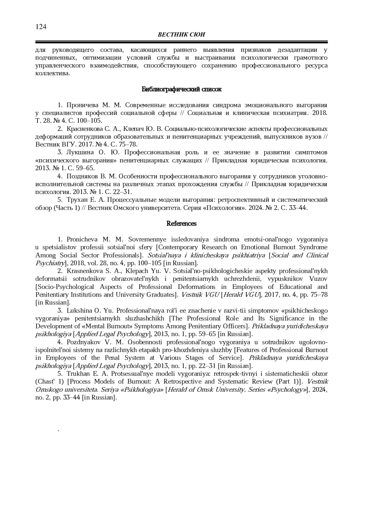 5. 	Трухан Е. А. Процессуальные модели выгорания: ретроспективный и систематический обзор (Часть 1) // Вестник Омского университета. Серия “Психология”. 2024. № 2. С. 33-44. EDN: YBDSQL