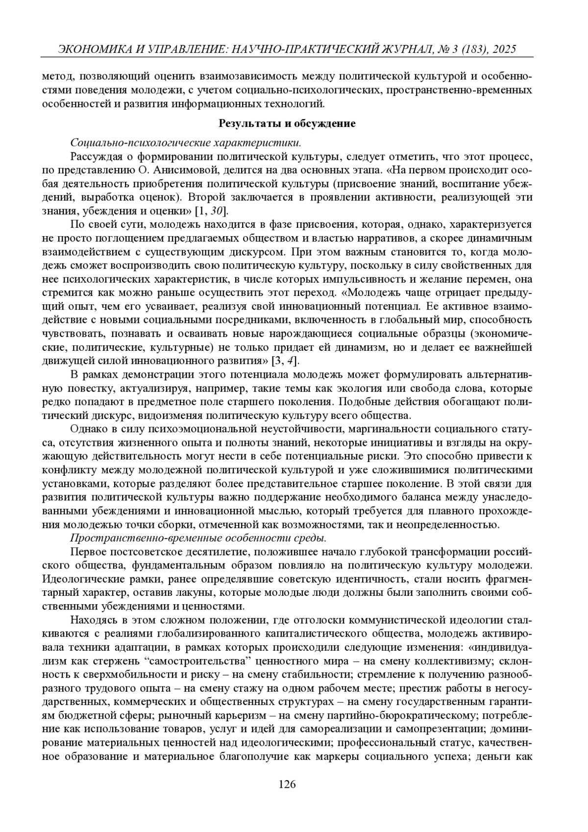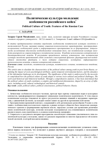 В статье предпринимается попытка определить особенности политической культуры молодежи в постсоветской России, оценивая влияние социально-психологических характеристик, пространственно-временных особенностей среды и информационного пространства на ее формирование. Актуальность исследования обусловлена необходимостью понимания того, как политическая культура молодежи реагирует на социокультурные и политические вызовы. В работе использовались исторический и бихевиористический методы. В результате проведенного анализа установлено, что политическая культура молодежи представляет собой сложный и многогранный феномен, формируемый под воздействием множества факторов, в числе которых социальные, культурные, информационнотехнологические аспекты, а также исторический контекст