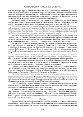 Ключевым этапом для формирования основополагающих политических установок становится период молодости, что позволяет в рамках научного дискурса говорить о молодежной политической культуре. В. Крикунова определяет ее как «совокупность типичных форм мышления и поведения молодежи в публичной сфере, воплощающих ценностные представления о смыслах и целях развития мира политики и закрепляющих устоявшиеся нормы и традиции взаимоотношения государства и общества в соответствующих деятельности институтов власти, и создающих преемственность политического развития социума»