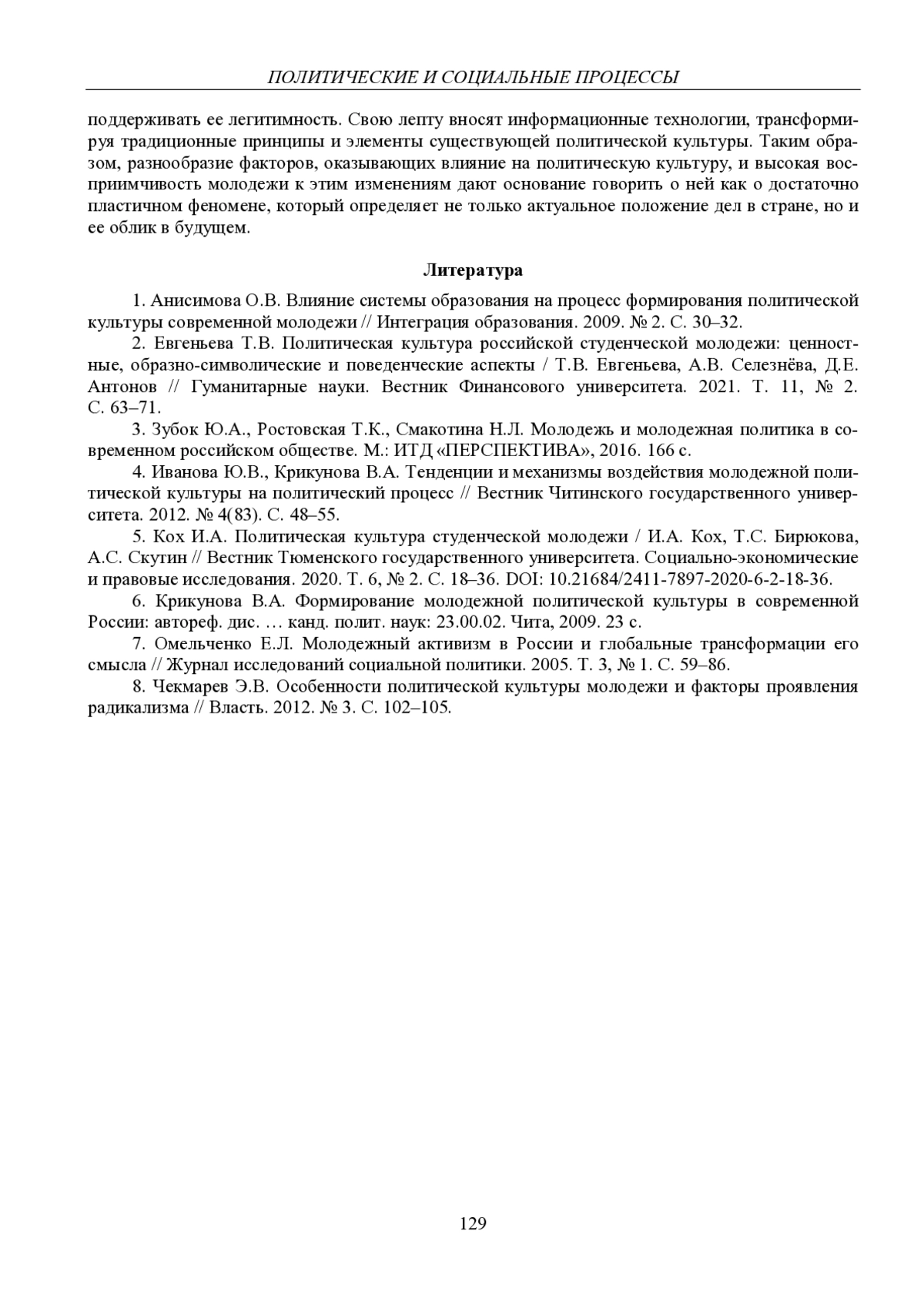 1. Анисимова О.В. Влияние системы образования на процесс формирования политической культуры современной молодежи // Интеграция образования. 2009. № 2. С. 30-32. EDN: KVDIFR