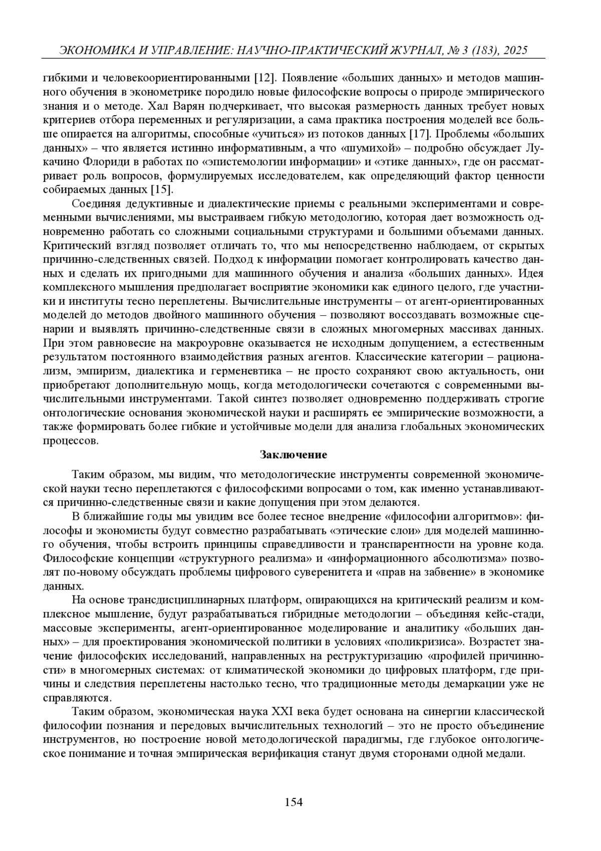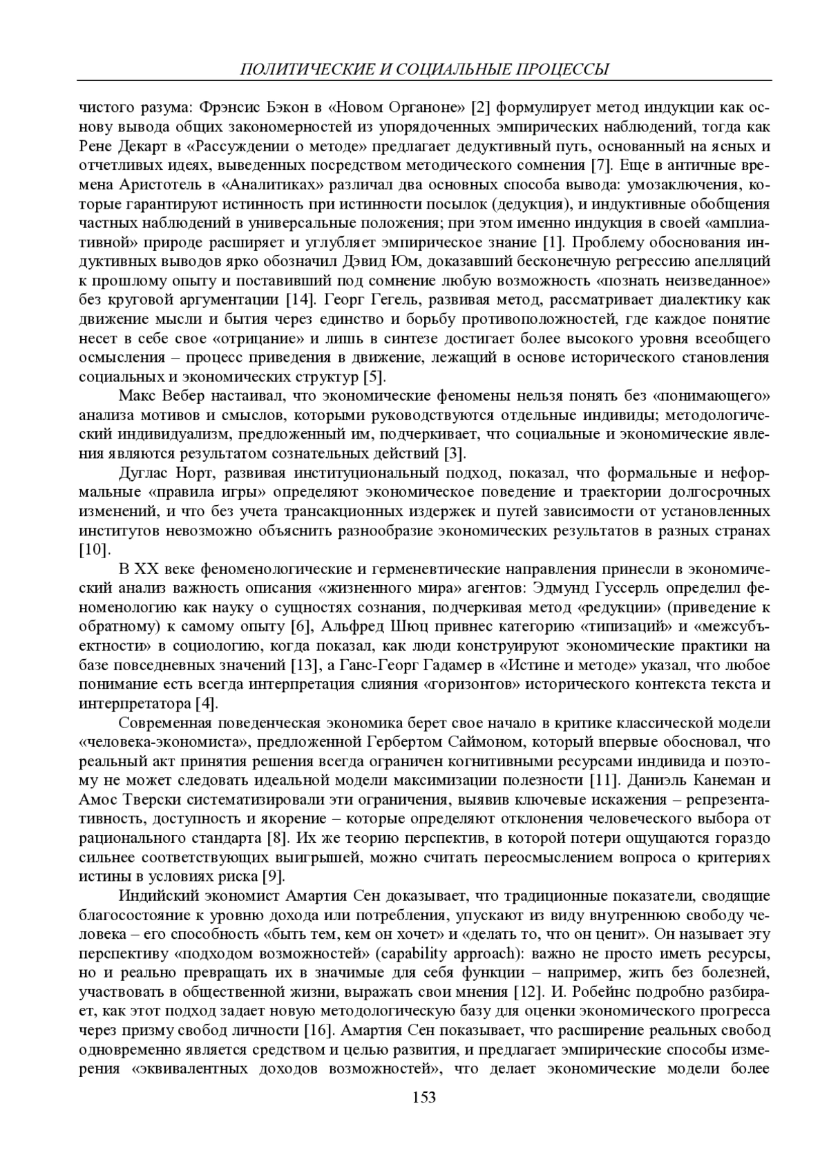 В статье прослеживается эволюция философских основ экономической методологии – от синкретического мышления представителей древних обществ до современных вычислительных и экспериментальных приемов. На примере Бэкона и Декарта показано, как индукция и дедукция формировали научный метод Нового времени, а Аристотель и Юм заложили основы понятий дедукции и индукции. Рассматриваются диалектика Гегеля, «понимающее объяснение» Вебера, институциональный подход Норта и Остром, а также некоторые аспекты феноменологического и герменевтического анализа. Внимание уделено поведенческой экономике, методам анализа «больших данных», их философским основаниям и перспективам интеграции классических категорий с современными технологиями
