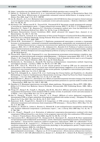 31. 	Kammeyer R.M., Pargett M. S., Rundell A. E.Comparison of CPR outcome predictors between rhythmic abdominal compression and continuous chest compression CPR techniques // Emerg. Med. J. 2014. May; Vol. 31, No. 5. Р. 394-400.