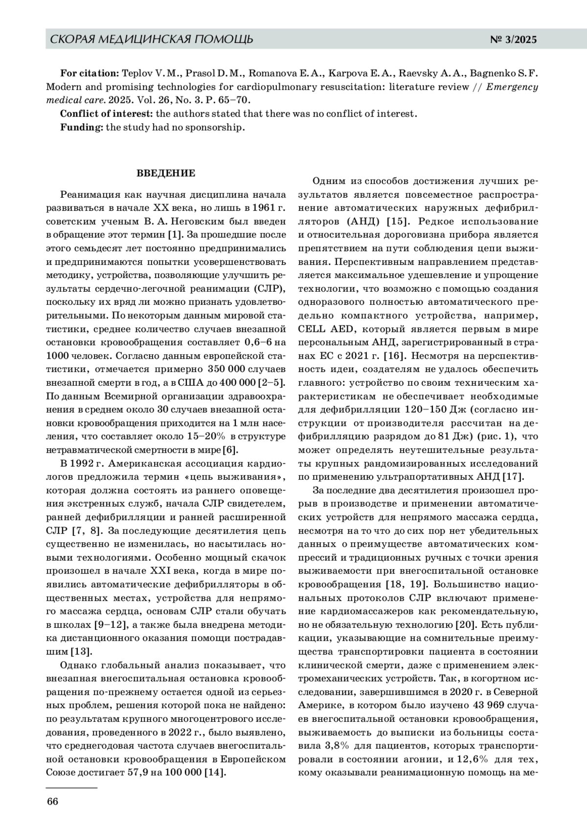 23. 	Теплов В.М., Прасол Д. М., Романова Е. А. и др. Доклинические испытания отечественных устройств, применяемых при внегоспитальной остановке кровообращения // Медицина катастроф. 2024. № 3. С. 61-64.