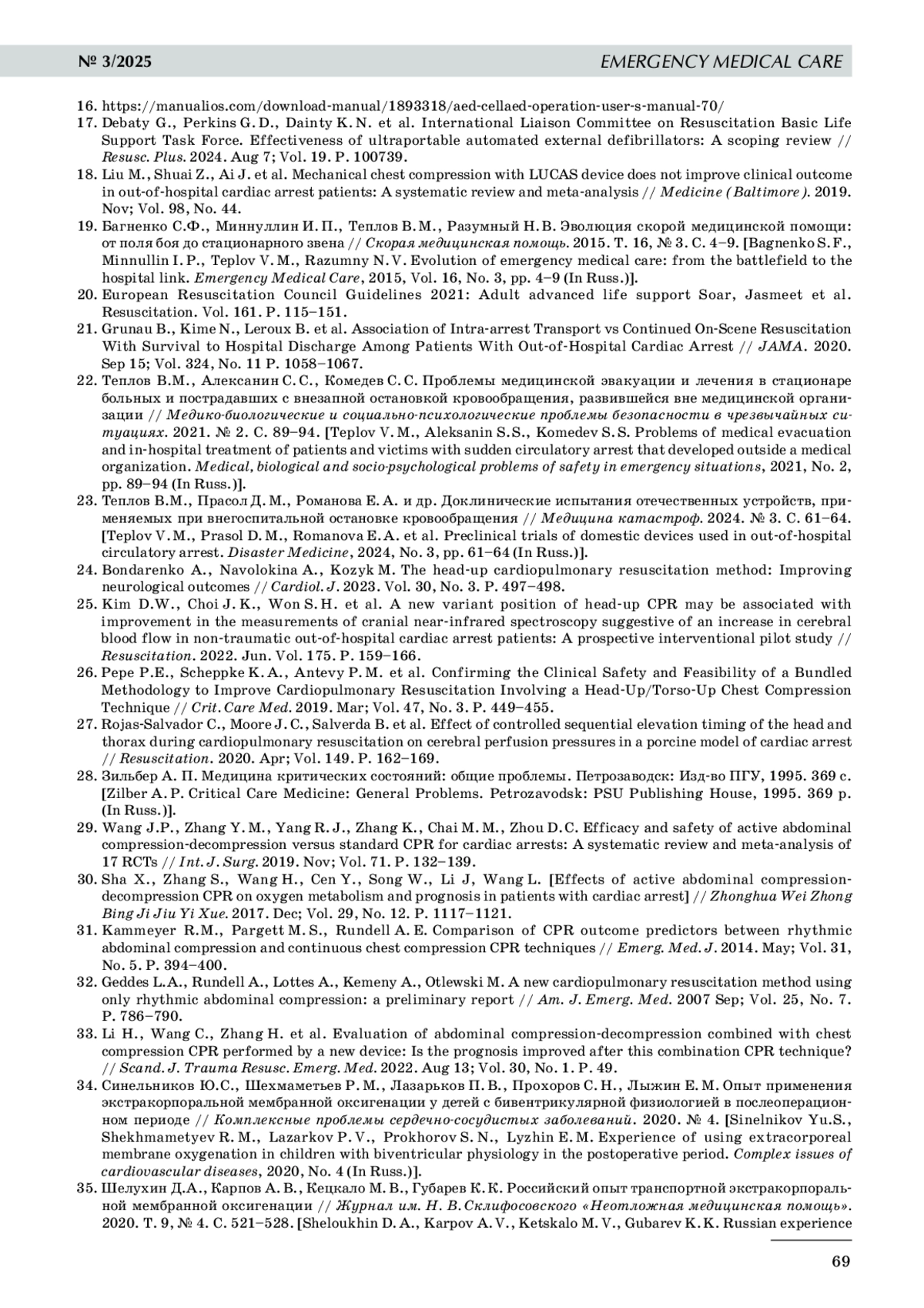 29. 	Wang J.P., Zhang Y. M., Yang R. J., Zhang K., Chai M. M., Zhou D. C. Efficacy and safety of active abdominal compression-decompression versus standard CPR for cardiac arrests: A systematic review and meta-analysis of 17 RCTs // Int. J. Surg. 2019. Nov; Vol. 71. Р. 132-139.
