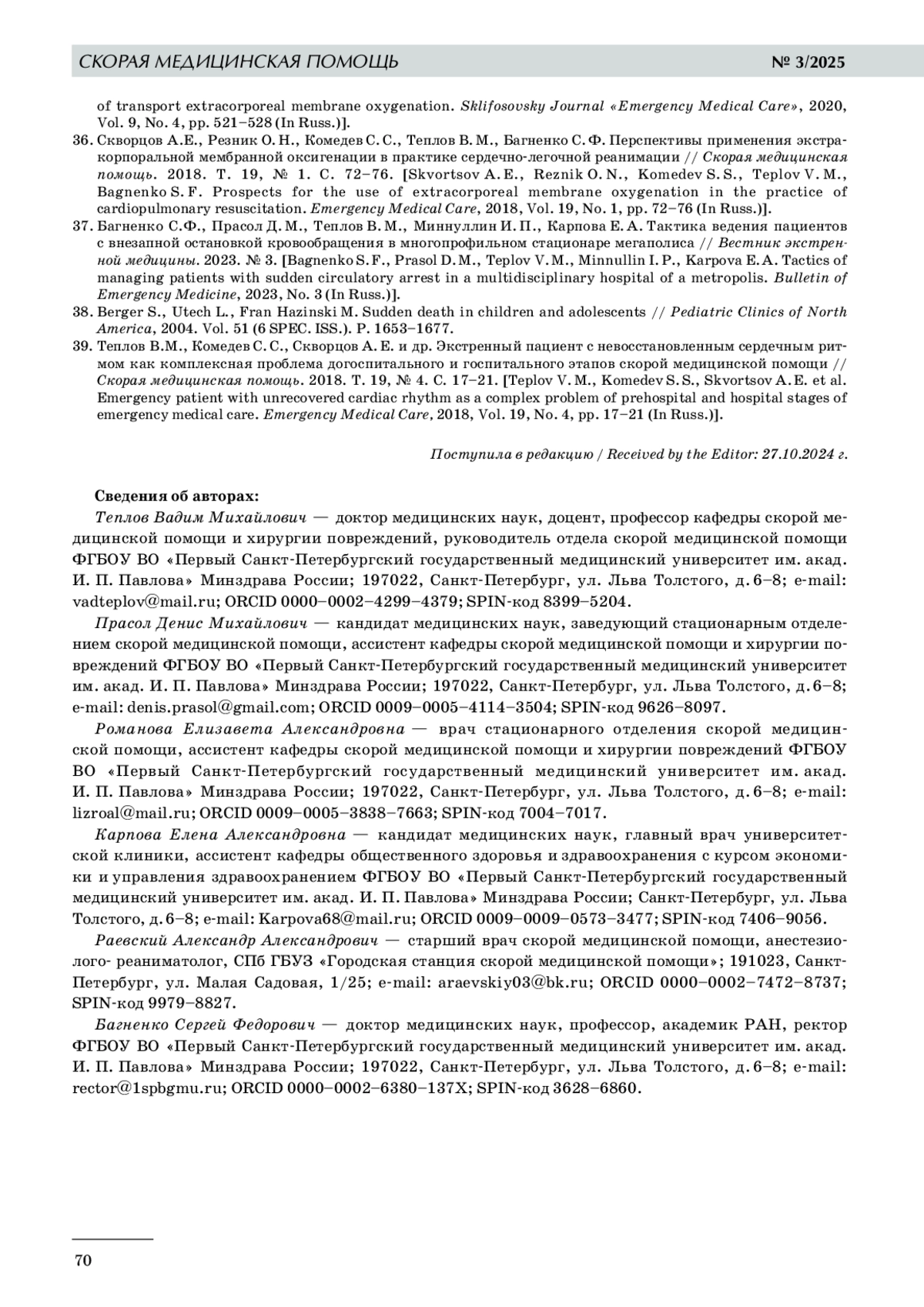 39. 	Теплов В.М., Комедев С. С., Скворцов А. Е. и др. Экстренный пациент с невосстановленным сердечным ритмом как комплексная проблема догоспитального и госпитального этапов скорой медицинской помощи // Скорая медицинская помощь. 2018. Т. 19, № 4. С. 17-21. EDN: VQOIKL