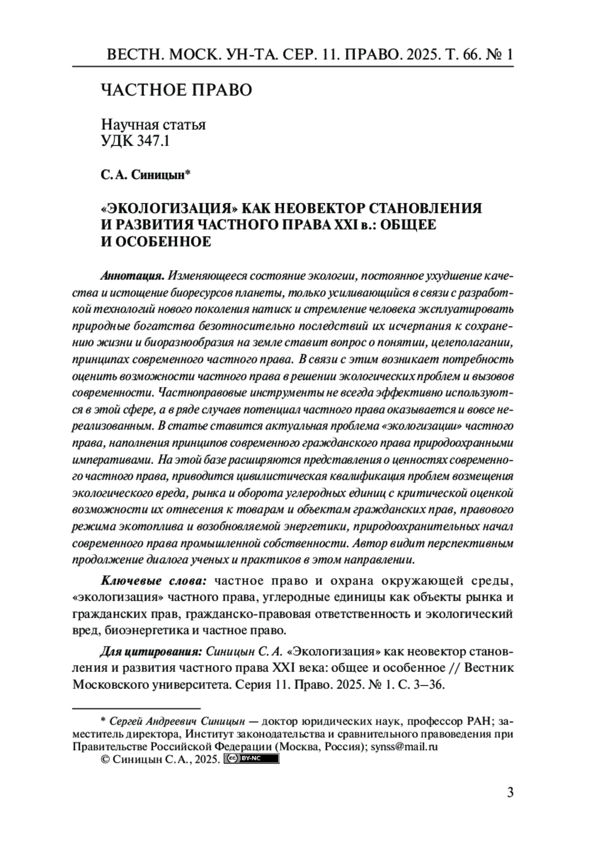 Изменяющееся состояние экологии, постоянное ухудшение качества и истощение биоресурсов планеты, только усиливающийся в связи с разработкой технологий нового поколения натиск и стремление человека эксплуатировать природные богатства безотносительно последствий их исчерпания к сохранению жизни и биоразнообразия на земле ставит вопрос о понятии, целеполагании, принципах современного частного права. В связи с этим возникает потребность оценить возможности частного права в решении экологических проблем и вызовов современности. Частноправовые инструменты не всегда эффективно используются в этой сфере, а в ряде случаев потенциал частного права оказывается и вовсе нереализованным. В статье ставится актуальная проблема «экологизации» частного права, наполнения принципов современного гражданского права природоохранными императивами. На этой базе расширяются представления о ценностях современного частного права, приводится цивилистическая квалификация проблем возмещения экологического вреда, рынка и оборота углеродных единиц с критической оценкой возможности их отнесения к товарам и объектам гражданских прав, правового режима экотоплива и возобновляемой энергетики, природоохранительных начал современного права промышленной собственности. Автор видит перспективным продолжение диалога ученых и практиков в этом направлении.