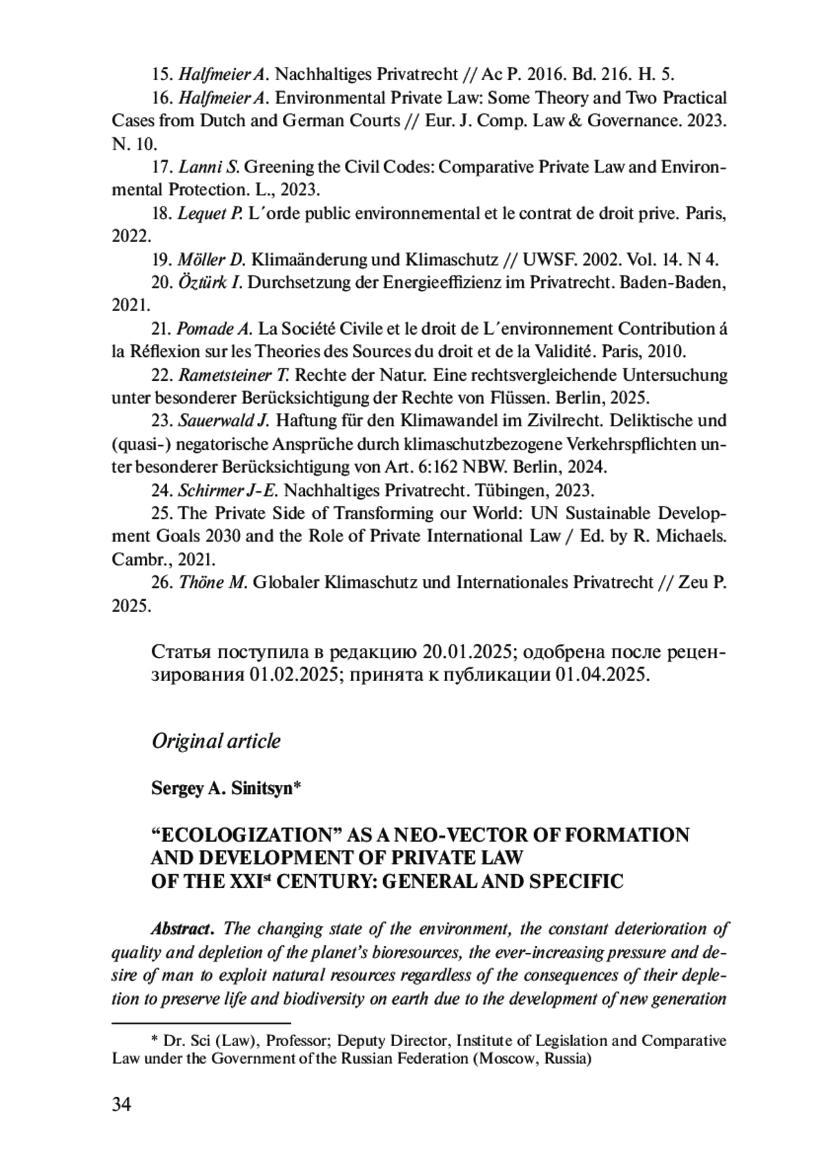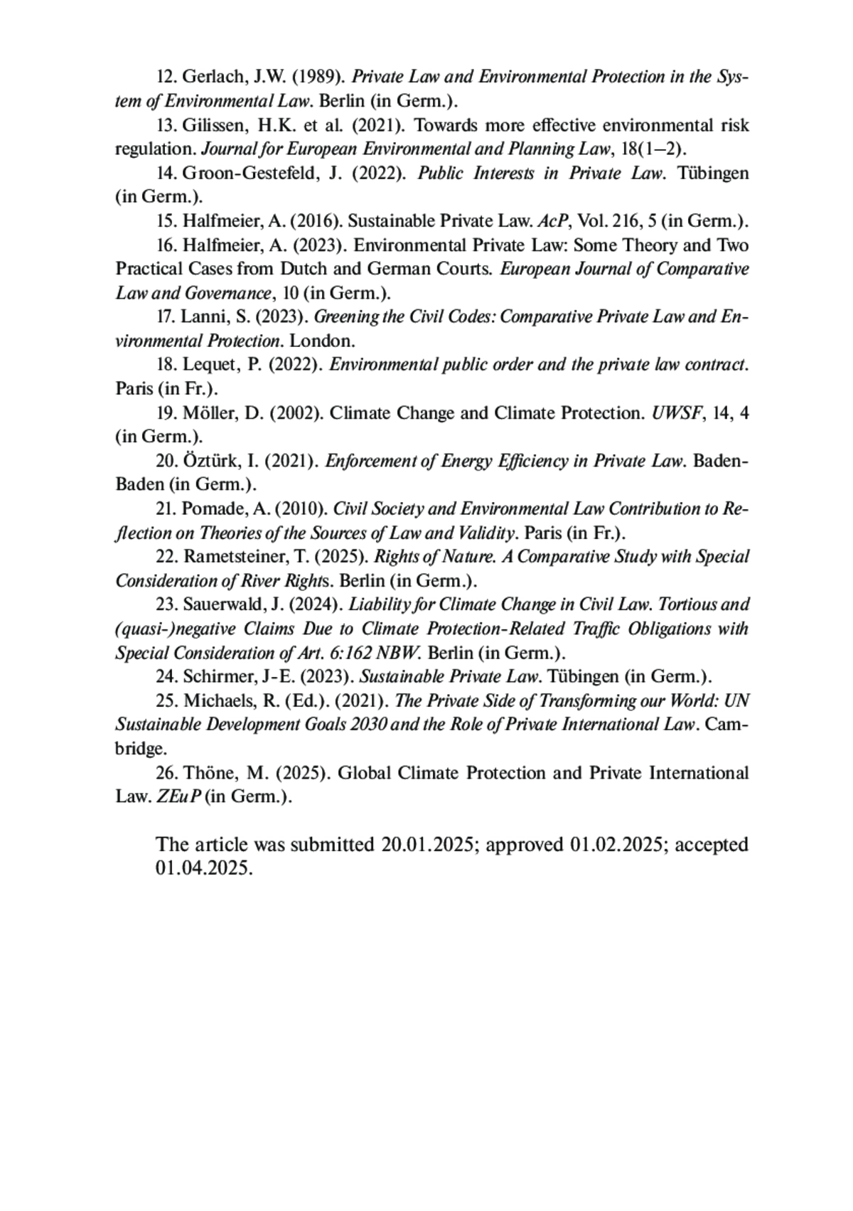 16. 	Halfmeier А. Environmental Private Law: Some Theory and Two Practical Cases from Dutch and German Courts // Eur. J.Comp. Law & Governance. 2023. N. 10.