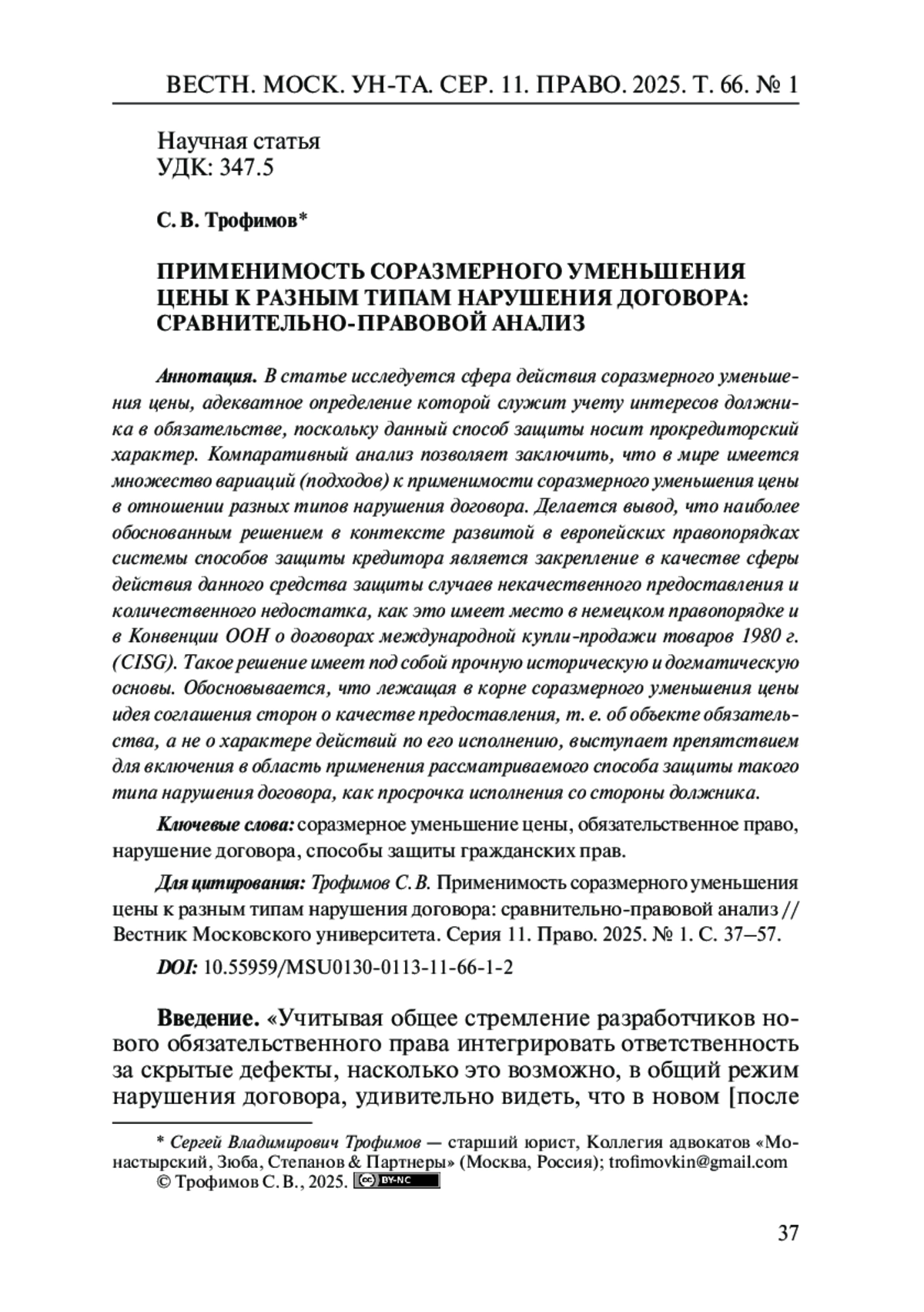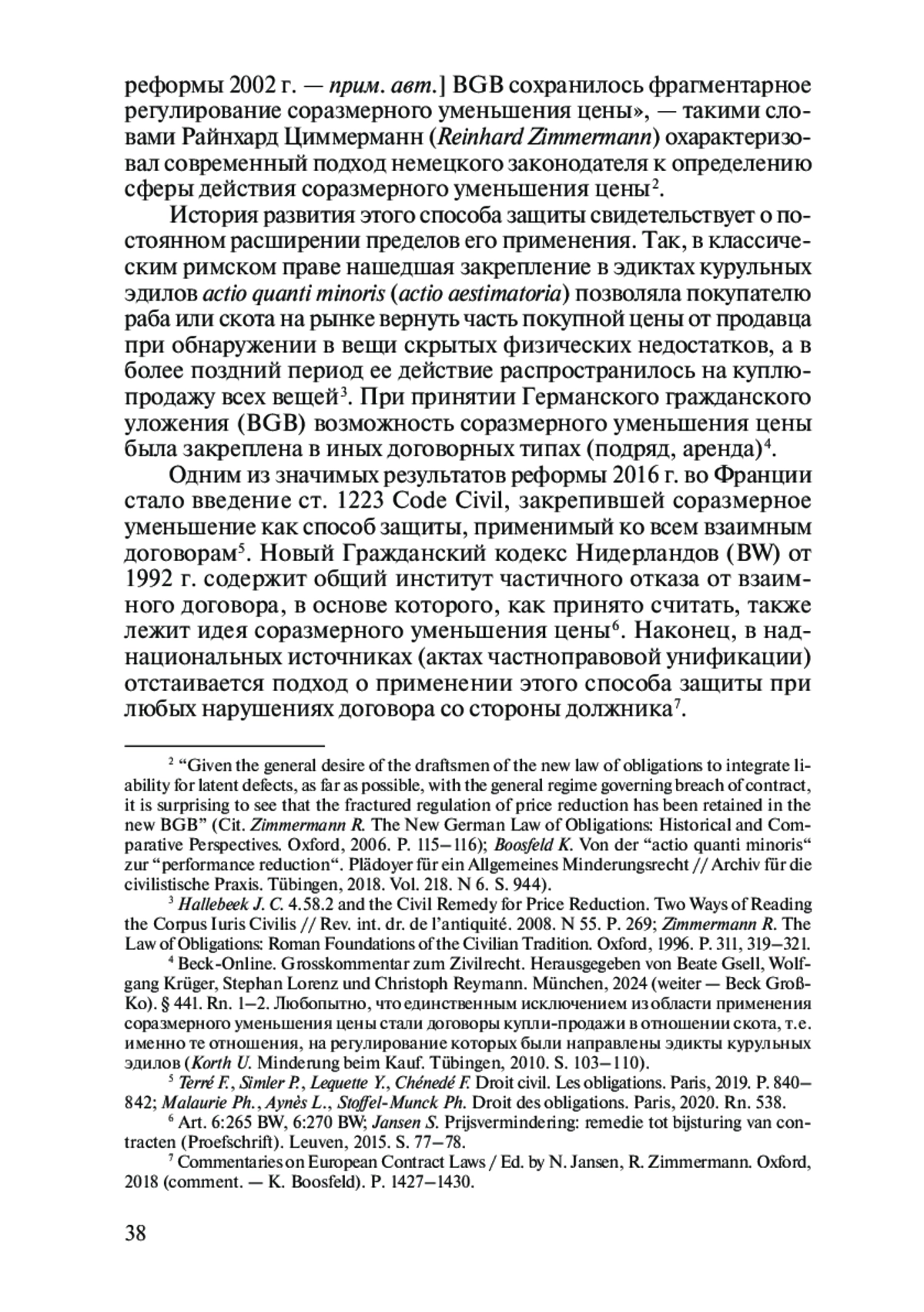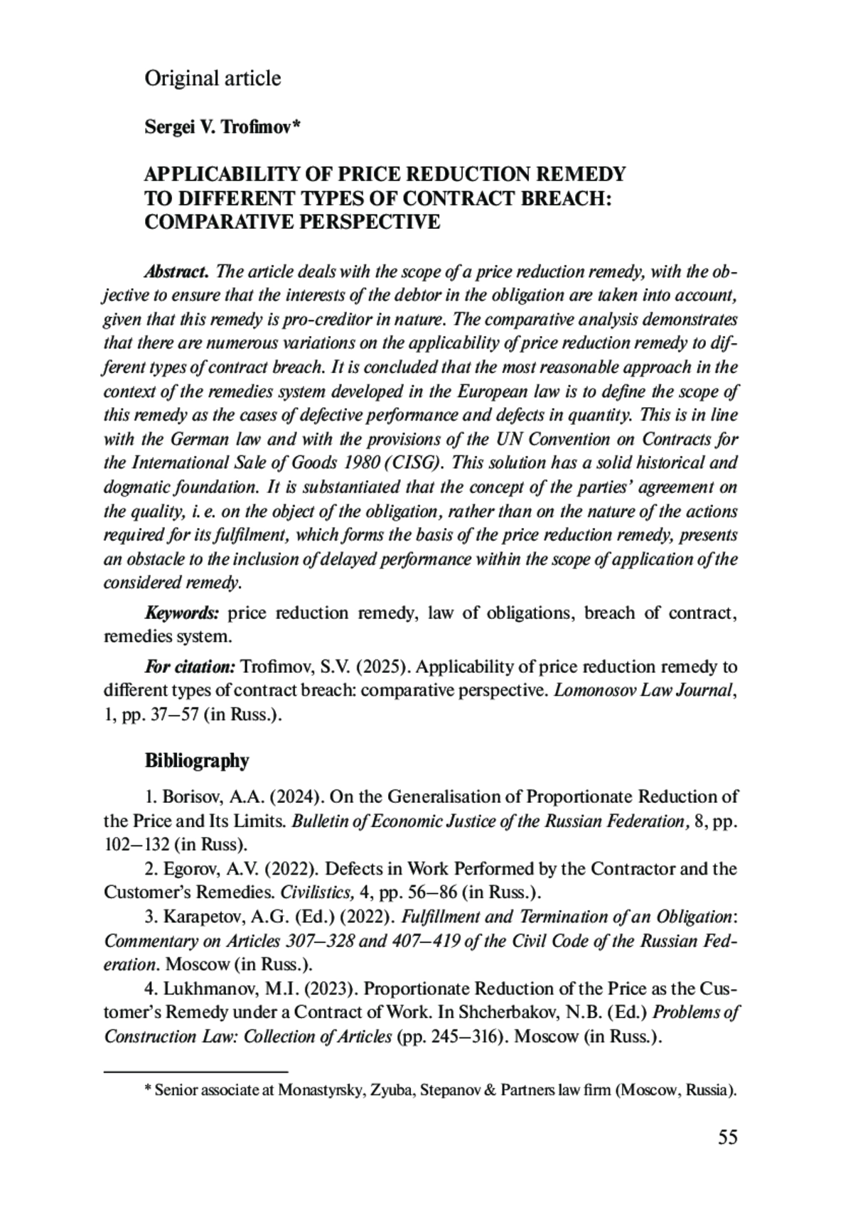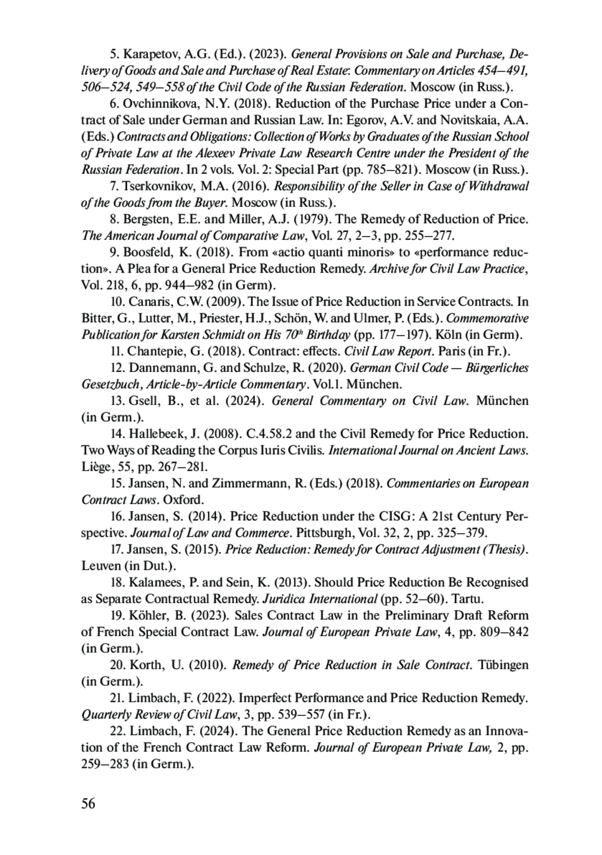 22. 	Limbach F. Das allgemeine Minderungsrecht als Innovation der französischen Vertragsrechtsreform // Zeitschrift für europäisches Privatrecht. 2024. N 2. P. 259-283.