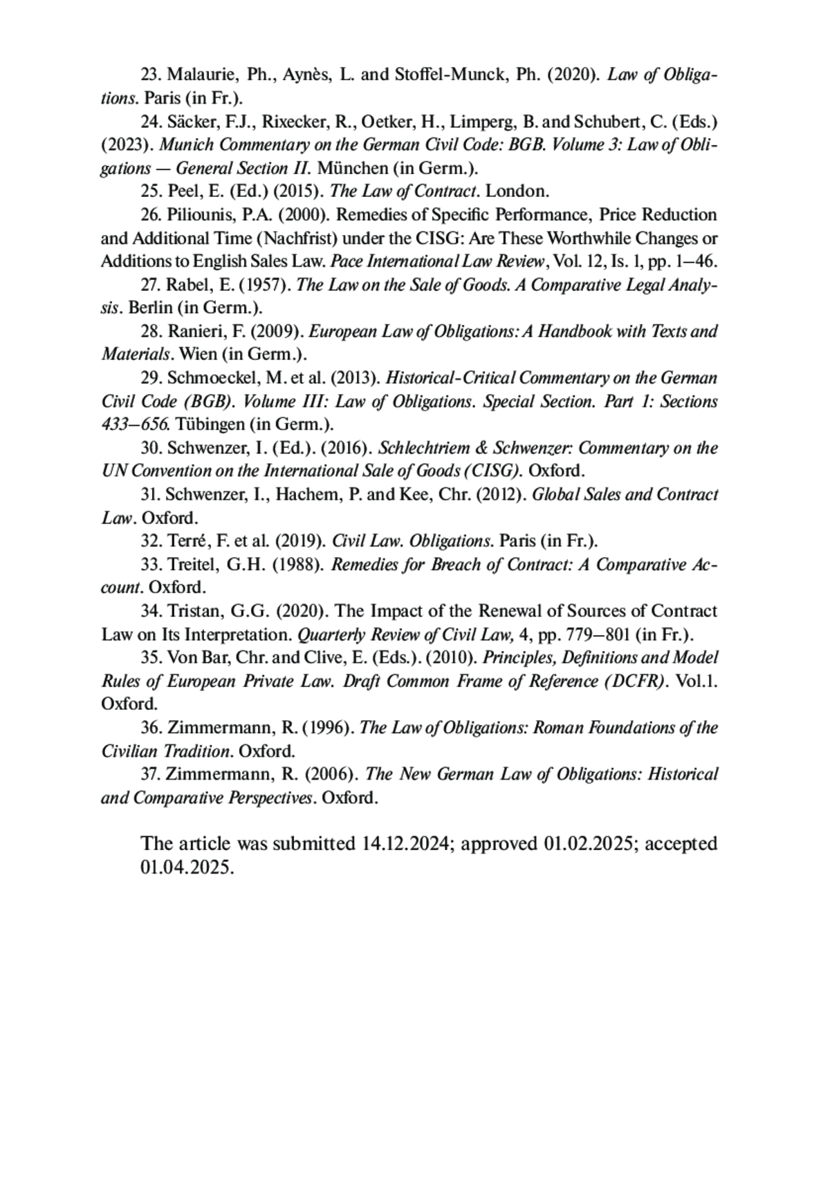 26. 	Piliounis P. A. Remedies of Specific Performance, Price Reduction and Additional Time (Nachfrist) under the CISG: Are These Worthwhile Changes or Additions to English Sales Law // Pace Int’l L. Rev. 2000. Vol. 12. Is. 1. P. 1-46.