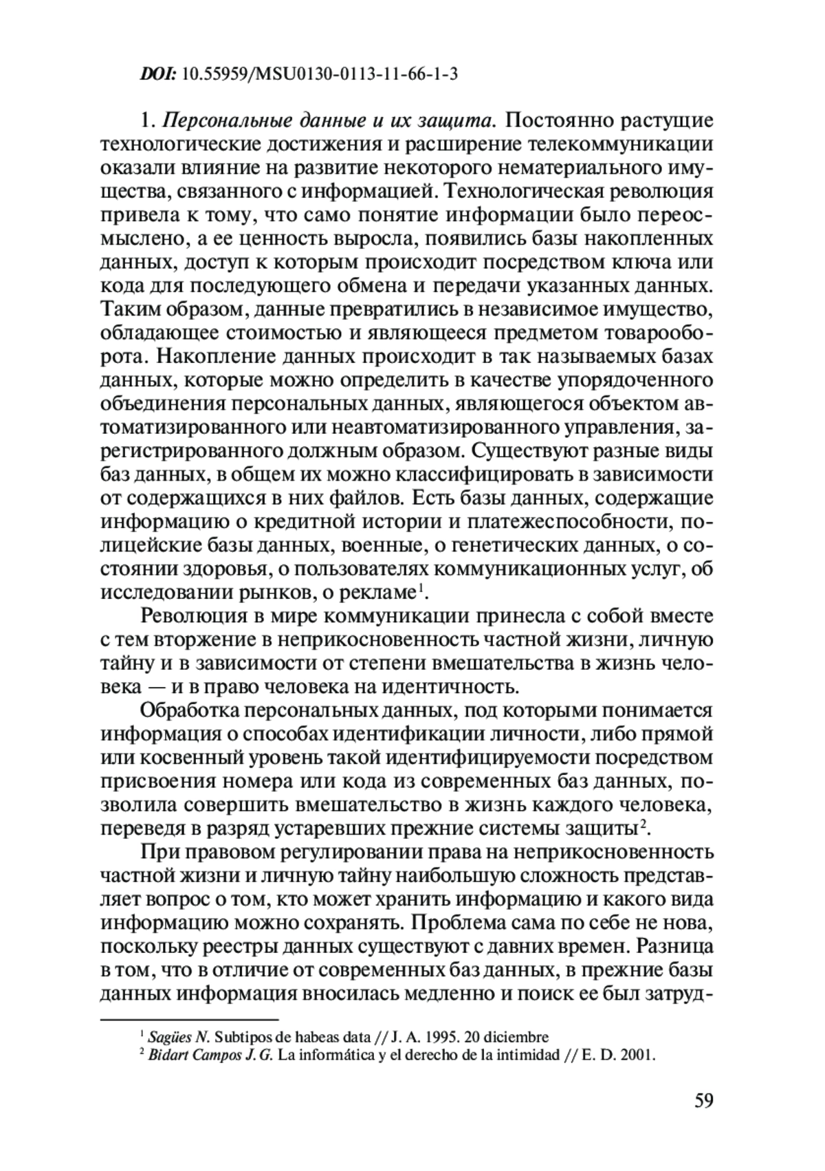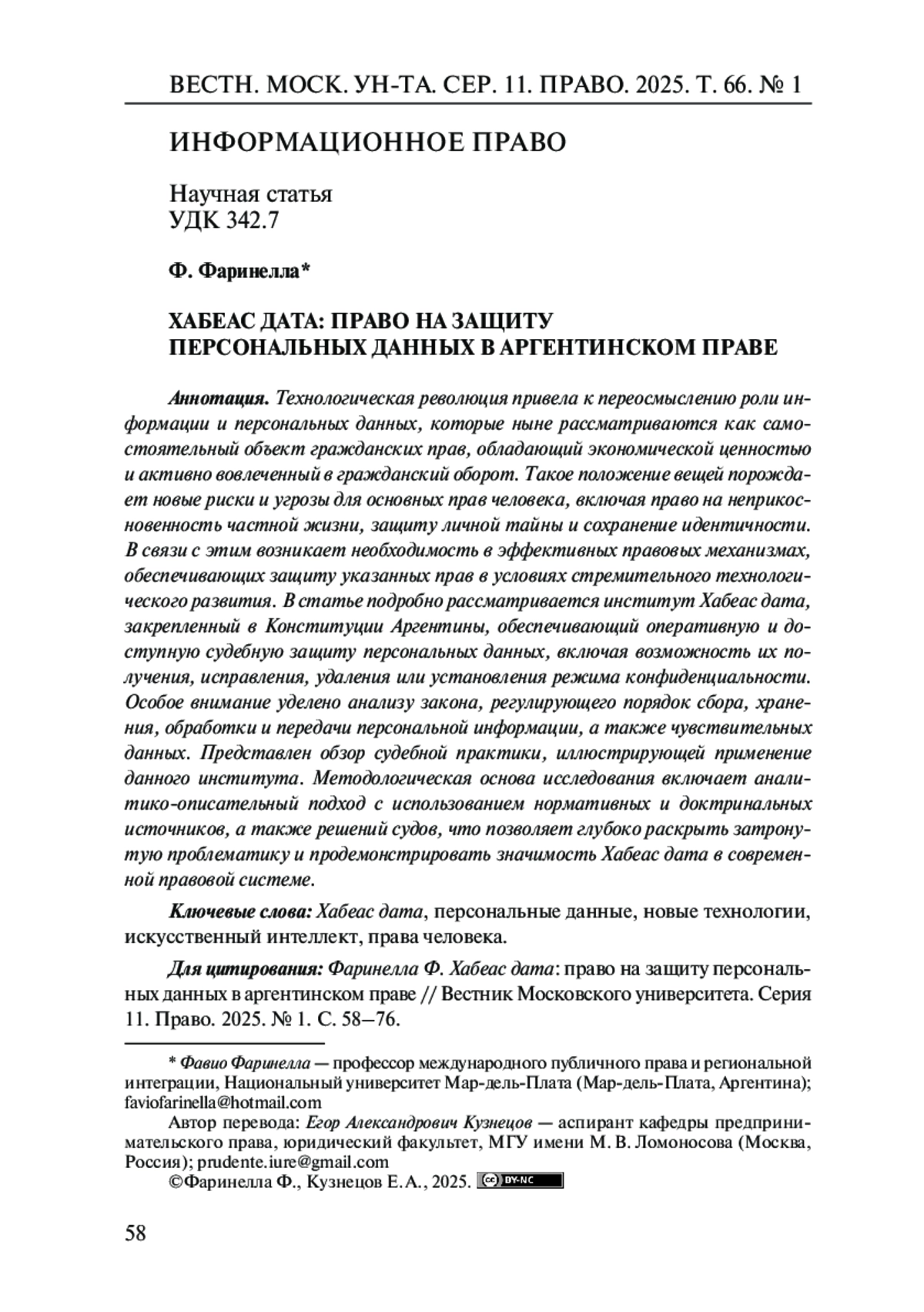 ФАРИНЕЛЛА Ф. ХАБЕАС ДАТА: ПРАВО НА ЗАЩИТУ ПЕРСОНАЛЬНЫХ ДАННЫХ В АРГЕНТИНСКОМ ПРАВЕ // ВЕСТНИК МОСКОВСКОГО УНИВЕРСИТЕТА. СЕРИЯ 11: ПРАВО. 2025. № 1