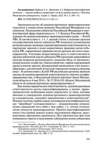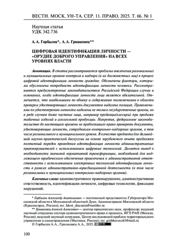 В статье рассматривается проблема вовлечения региональных и муниципальных органов контроля и надзора (и их должностных лиц) в процесс цифровой идентификации личности граждан. Обозначены факторы, которыми обусловлена потребность идентификации личности человека. Рассматриваются предусмотренные законодательством Российской Федерации случаи и основания, когда идентификация личности лица является обязательной. Отмечается, что наибольшими по объему и содержанию полномочиями в области проверки удостоверяющих личность документов наделена полиция. Правомочиями по удостоверению личности наделены не только государственные органы, но в ряде случаев даже частные лица, например продавцы(кассиры) при продаже табачных изделий и алкогольной продукции. Напротив, федеральное законодательство до настоящего времени не предоставило право проверять документы, удостоверяющие личность, сотрудникам контрольно-надзорных органов, в том числе регионального и муниципального уровня. В качестве предмета для дальнейшей научно-практической дискуссии на основе зарубежного опыта предложен поэтапный порядок проведения идентификация личности административных правонарушителей с использованием цифровых технологий. Делается вывод о необходимости значимой нормативной трансформации, необходимой для надлежащего юридического обеспечения привлечения к административной ответственности с использованием электронных технологий идентификации личности в рамках административно-юрисдикционной деятельности (в том числе региональных и муниципальных контрольно-надзорных органов).