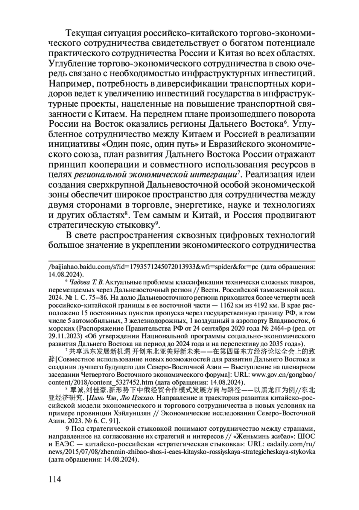 10. 	Чадова Т. В. Актуальные проблемы классификации технически сложных товаров, перемещаемых через Дальневосточный регион // Вестн. Российской таможенной акад. 2024. № 1. С. 75-86.