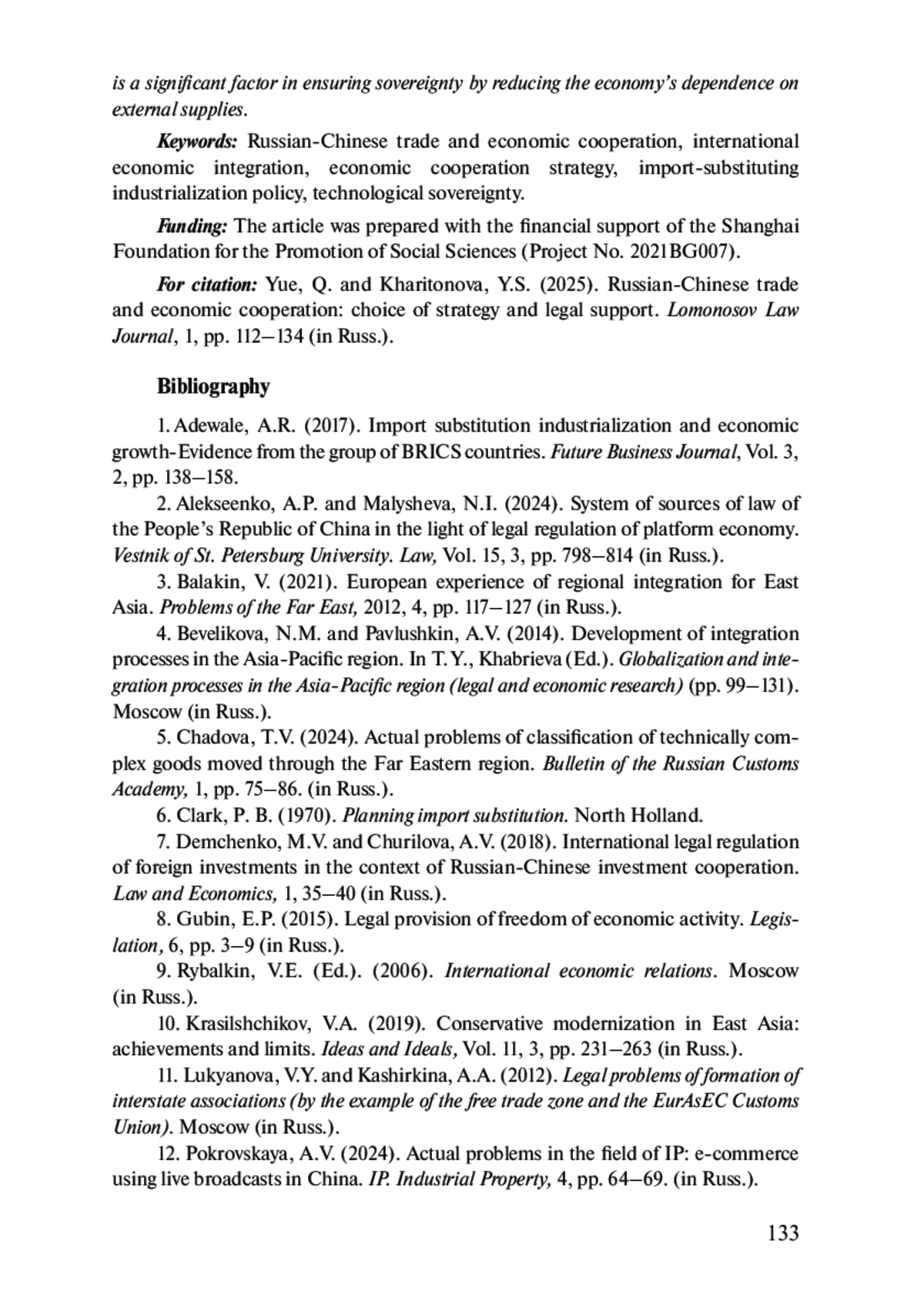 6. 	Демченко М. В., Чурилова А. В. Международно-правовое регулирование иностранных инвестиций в контексте российско-китайского инвестиционного сотрудничества // Право и экономика. 2018. № 1. С. 35-40. EDN: YPTQKD