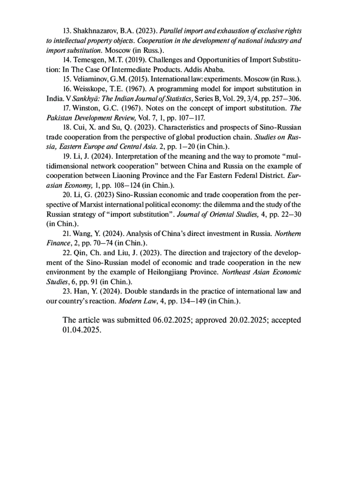 19. 	李冠群.马克思主义国际政治经济学视域下的中俄经贸合作 俄罗斯“进口替代“战略的困境与探索//东方学刊 [Ли Г. Китайско-российское экономическое и торговое сотрудничество с точки зрения марксистской международной политической экономии: дилемма и исследование российской стратегии “импортозамещения” // Журнал востоковедения. 2023. № 4. C. 22-30].